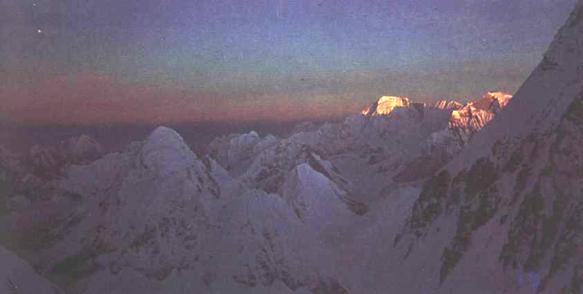 Я был уже выше Северной седловины, когда первые лучи утреннего солнца осветили вершины Чо Ойю и Гиачунг Канг. Казалось, что прекрасная Пумори лежит ниже меня. Хотя на западе появились первые облачные массы, я еще не беспокоился о погоде. Я быстро шел вперед.