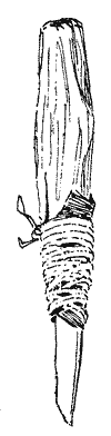 Але тієї ж хвилини я згадав про іншу річ — про залізні скріпи від ящиків. Їх у мене було скільки завгодно. Цілком годиться! Вони служитимуть не гірше за дріт. Ці гнучкі тонкі смужки заліза, намотані навколо деревинки й частини леза, чудово триматимуть його на місці і не дадуть йому хитатись. Поверх усього я намотаю ще й мотузку, щоб стягнути металеве кріплення й не дати йому ослабнути. Отже, в мене буде зовсім непогана колодочка.