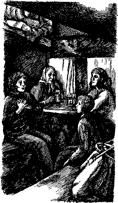 И Лене очень нравится Ларисина форма. Он уже примерял шапку, она ему «почти как раз», только немножко сползает на глаза. Лариса складывает книги в маленький, обшарпанный, с оторванной ручкой чемоданчик. — Мы будем жить вчетвером в комнате, — рассказывает она матери. — Я уже подружилась с девочками. Мать ходит по комнате туда и сюда, ей хочется чем-то помочь дочке, но она не знает чем. — Может, тебе белье положить? — спрашивает она. — А зачем, мамочка? — удивляется Лариса. — Там ведь у нас все казенное будет. Вот разве салфеточку эту возьму, — показывает она на вышитую круглую салфеточку, которой укрыта верхняя полка этажерки. — На тумбочку свою постелю. — Бери, бери, — соглашается мать и торопливо снимает с этажерки пустые флаконы из-под одеколона, стоящие там для украшения. Сережка тоже хочет чем-то помочь сестре, он ходит вокруг стула, на котором стоит чемоданчик. — Как же ты понесешь его? — спрашивает он. — У него же ручка оторвана… — И лицо у Сережки проясняется. — Я его тебе мигом починю! Сережка бросается к столику, вытаскивает ящик, в том ящике гвозди, шурупы, ролики… Сережка усердно роется в этих сокровищах и наконец находит то, что надо — кусок медной проволоки. — Вот! — радуется брат. — Сейчас мы так прикрутим твою ручку, что век не оторвется! Сережка колдует над чемоданом. Леня вертится вокруг, готовый по первому зову прийти на помощь, но Сережка только отгоняет его, чтоб не мешал. Очень старается Сережа. Несколько раз прикрутил ручку проволокой и теперь хочет перегнуть и отломать остаток. Но проволока крепкая, не поддается. Еле справился Сережка с лишним хвостом, торчащим из ручки чемоданчика. — Во, видала! — торжествующе поднимает он чемоданчик за отремонтированную ручку. — Сто лет не оторвется! Лариса уже собралась. Ей надо скорее идти. Во-первых, на улице ждет Володя, а во-вторых, ей не хочется видеть отчима. Ведь если он придет, то, прощаясь со всеми, придется прощаться и с ним. А Лариса его ненавидит. Все уже собрано, все готово. Можно прощаться, но здесь послышались знакомые тяжелые шаги. Возвращался с работы отчим. И Лариса, и мать, и даже Сережа уже сообразили — пьяный. Тихо, настороженно сделалось в доме. — Только не ругайся, мамка, — горячо шепчет Лариса. — Не ругайся, мамочка… Пускай хоть последний вечер тихо у нас будет… Дверь широко распахнулась, и на пороге отчим — опущенные плечи, мутный взгляд. Проходит в комнату и плюхается на табуретку. В руках какой-то сверток — подержал немного, положил на стол. Смотрит на Ларису, будто видит ее в первый раз. — А ну, покажись, покажись… В форме… — У нее и шапка есть, вот, — схватил Ларисину шапку Леня. — Она и мне хорошо, глянь! — Казалось, не зацепись шапка за Ленины уши, в шапке утонуло бы все курносое мальчишечье лицо. Отец снял шапку с Лениной головы, долго вертел в руках, внимательно разглядывал. — Р-рабочий класс, стало быть, — снова улыбнулся он Ларисе. — А я тебе вон что принес, — и нетвердой рукой дотянувшись до стола, взял сверток. Неловкими пальцами стал распутывать веревочку, но пальцы не слушались, и он разорвал ее. Развернул бумагу. Там были туфли. Новые, дорогие туфли. Лариса знала, что они дорогие. Такие были у Оли. Лариса и мечтать не могла о таких туфлях, разве посмела бы она просить мать, чтобы ей такие купили. — Вот, бери, это тебе, — сказал отчим. Лариса смотрела на туфли. 