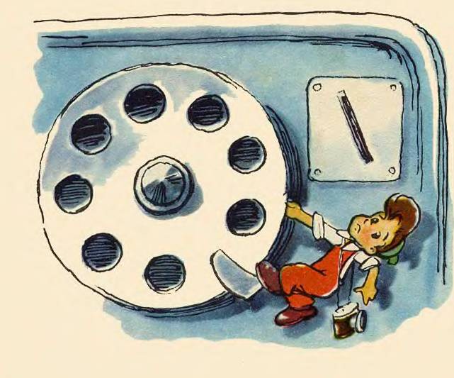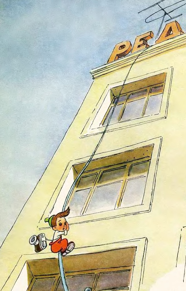 Но вот что значит быть смелым, ловким и находчивым! Пролетая мимо телевизионной антенны, Мурзилка ухватился за неё руками и по проводу спустился прямо в окно кабинета редактора. Он поспел вовремя.