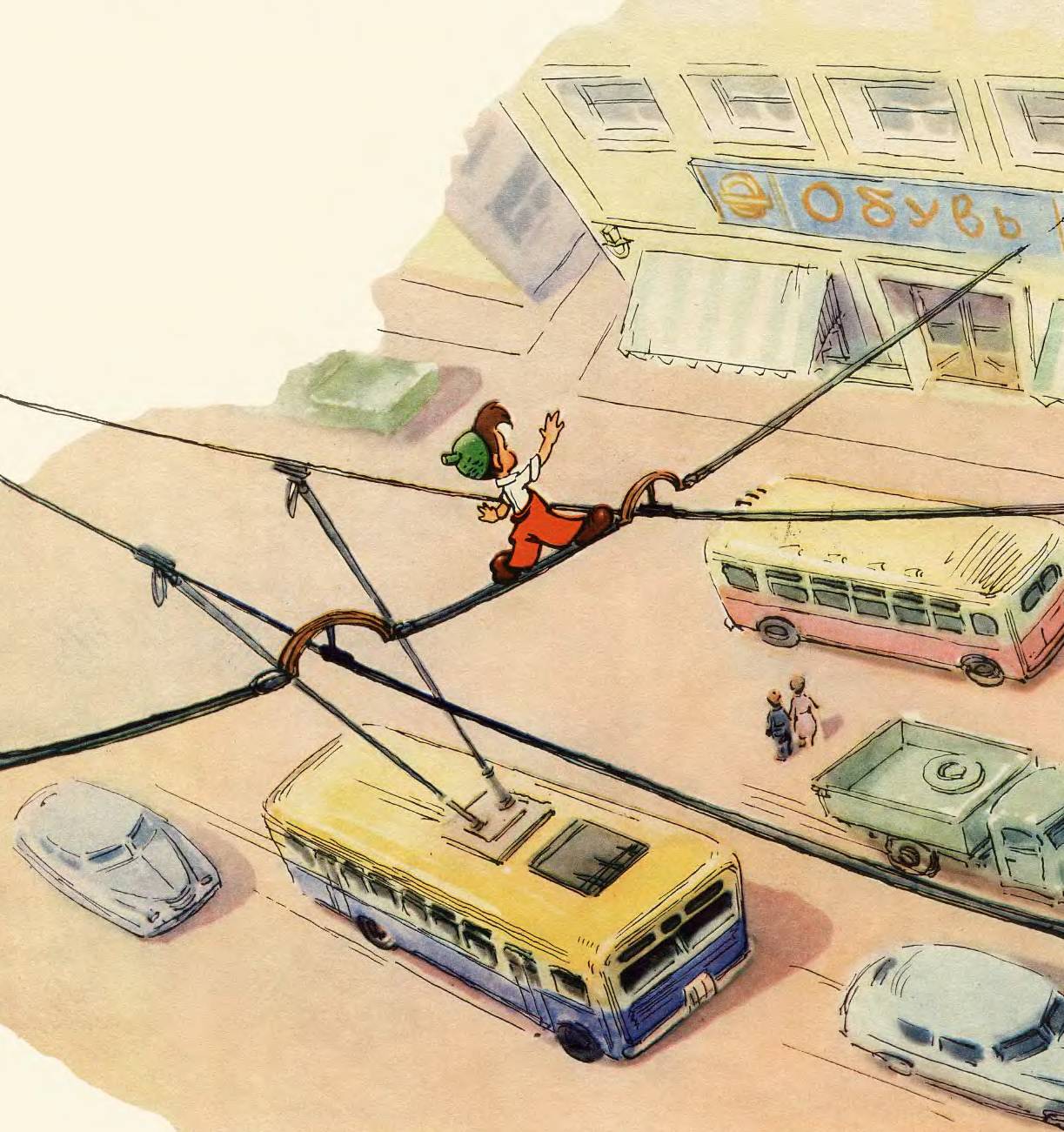 Как цирковой акробат по канату, идёт Мурзилка по проводу на другую сторону улицы. Ещё несколько шагов... прыжок... и он у цели.