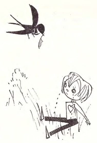 Серебряный самолет приземлился у родника. Тончо и Платьице спустились по трапу и поспешили умыться студеной водой. Посмотрели по сторонам, нет ли где доброй Ласточки, но окрестные деревья были пусты. Они уже было растерялись, не зная, что делать дальше, как вдруг на соседней полянке раздался какой-то шорох. Друзья направились туда и немного погодя увидели, как добрая Ласточка трепыхается в густой траве. Из ее глаз текли слезы.