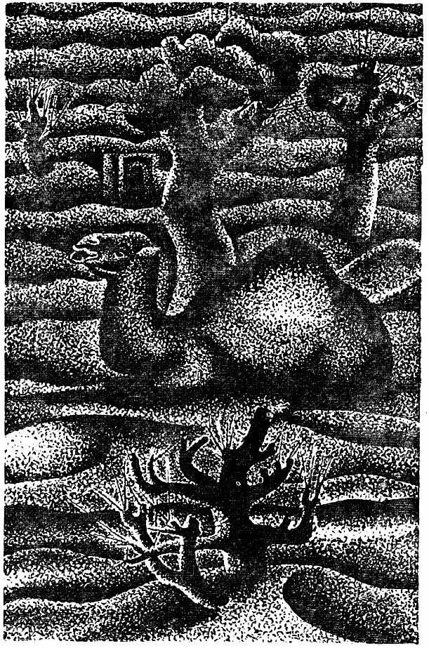 Говоря о нынешнем населении древних городов, нельзя не вспомнить про змей. Пожалуй, каждый год на раскопках или в лагере от наших рук гибнет какая-нибудь змея. Иногда эти встречи оканчиваются мирно. Как-то я поднялся на стену крепости, чтобы полюбоваться закатом. Вступил на гребень стены и вдруг прямо на том месте, куда собирался сесть, заметил свернувшуюся в кольцо змею с темным клетчатым узором на спине и пепельно-серыми боками. Обычно змеи уползают от человека, а эта не шевелилась. «Дохлая», — решил я и сел рядом. Насмотревшись на закат, я встал и ахнул: змеи не было! Закат собрал вместе человека и змею. Человек любовался последними лучами солнца. Змея тоже по-своему наслаждалась ими, и от этого ее холодная кровь делалась теплей. …Отмечаем день рождения одной девушки. Художник наломал для нее букет из веток цветущего саксаула. Мы расселись на брезенте, уставленном яствами и кружками с вином. Посередине стояло ведро с букетом. В самый разгар торжества из букета показалась змея. …После обеда собираемся у кровати нашего фотографа Жоры Павлиди. Прямо на живот благодушному Жоре кладем фанерку с приколотым к ней листком бумаги. Мы сочиняем кроссворд на археологические темы. — Кстати, Жора, что это за веревочка торчит у тебя из-под подушки? Жора не глядя хватается за веревочку и вскакивает как ужаленный. Из-под подушки выскальзывает змея. Однажды мне пришлось испытать настоящий страх перед змеями. Я раскапывал глубокую комнату, над которой сохранился даже остаток свода. В верхнем слое завала, прямо под сводом, я первым делом обнаружил несколько десятков упругих спиралевидных скелетов. Была как раз такая пора, когда змеи меняют кожу. А вдруг это их любимое место? Вдруг они снова приползут сюда? Вдруг уже ползут? Я несколько успокоился, когда сообразил, что змеи меняют кожу, но никак не кости и что вряд ли они навещают усыпальницу своих предков. И все-таки что это за странное змеиное кладбище? Каким образом оно возникло? Доводилось мне и жить под одним кровом со змеей в маленькой палатке. Мы с ней приходили и уходили в разное время, и я даже не подозревал о ее существовании. Но потом в палатке поселился архитектор. Целыми днями сидел он за складным столиком и чертил. Змея не могла дождаться, пока палатка опустеет, и выползла прямо из-под стола. Архитектор не растерялся. Могучею рукой он схватил змею чуть пониже головы, поднял над собой и удавил. Когда начинается буран, можно увидеть, как змеи, высоко поднимая головы и словно ввинчиваясь в воздух, куда-то быстро ползут против ветра. Им некогда обходить препятствия. И если на пути встретится палатка с приподнятыми полами, они бесстрашно проскальзывают между нашими стульями, кроватями, сапогами. После каждой встречи со змеей некоторое время испытываешь тревогу. Осматриваешь раскладушку перед сном вытряхиваешь сапог, прежде чем сунуть туда ногу. Но потом это проходит. Скорее всего тревога не изглаживается совсем, но она становится неосознанной и, наверное, что-то вносит в наше ощущение пустыни. …К нам приехали кинооператоры. До наших раскопок они снимали еще один сюжет — ловлю ядовитых змей. Герой этого сюжета, опытный поставщик змеиного яда на благо медицины, спросил операторов во время прогулки: — Сколько змей вы видите сейчас вокруг себя? Операторы огляделись и ответили: — Ни одной. Тогда лов