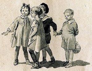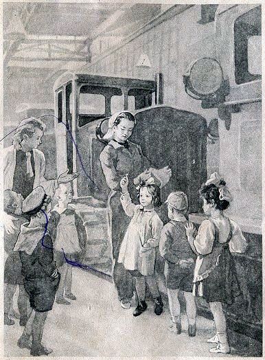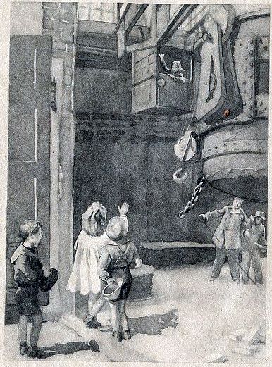 — Разве это твоё? Это — завода, — сказал Топа. — А завод чей? Он стоит на нашей советской земле. Значит, наш завод и мы на нём хозяева. Вот оно как, Топтыгин Иванович! — ответил Топин папа и весело засмеялся. — Папа, а где же катки? — вдруг вспомнил Топа. — Катки катаются, — пошутил папа и рассказал, что ящики с землёй — это формы, которые наполняются сталью. Потом, когда сталь остынет, из формы вынут готовый, отлитый каток. Софийка с завистью глядела на Топу: вот какой у него папа! Он умеет делать катки, а Петрусин — сталь плавит и даже вот какую огненную печь может наклонить. „А где же моя мама?“ — думала девочка. Ей и хотелось увидеть мать, и она боялась, что дети будут смеяться: ввинчивает какой-то маленький винтик! А больше всех, наверно, будет смеяться Топа — он такой! И Софийка тайком, сбоку взглянула на мальчика. Но он, должно быть, заметил этот взгляд, потому что надул губы и сделал так: „Пхе!“ „Ну, погоди! — подумала девочка. — Вот я попрошу маму, чтобы она научилась плавить сталь или делать катки. А может быть, она и рычаги сделает или мотор!“