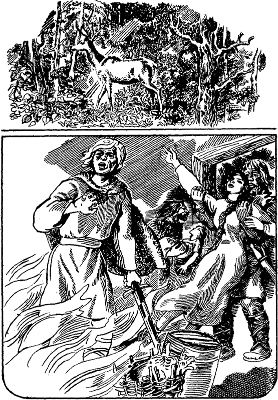 Намірився було піти в той бік, де, як гадав, мала бути річка, але покружляв серед дерев і повернувся назад. Місяць уже зовсім збляк, тільки пляма залишилась, і світла від неї майже не було. Зате зірки іскрилися, але була в їхній яскравості холодна відчуженість, ніби вони теж осуджували Роськові витівки. Сяк-так перебився він до ранку під деревом. Коли пробіг поглядом по галявині, помітив, що в траві, де були поставлені сильця, щось ворушилося. «Еге, видно, таки знали оті нічні полювальники цю місцину, щось упіймалося… — Тихцем підійшов ближче. — Може, вдасться поласувати?» Але це було всього-на-всього вовченя. Ще зовсім мале, кволе, воно борсалось у густій траві, ледь чутно повискуючи. Задня лапка потрапила у зашморг з волової жили, і вовченя смикалося, ще тісніше затягуючи його. — Як ти сюди потрапило? — Росько нагнувся над ним. — Чого тебе носить так рано, ще до схід сонця? Ну, не скигли, не скигли. Зараз я тебе звільню. Ось так, потерпи… Бач, аж у тіло в’їлася, — послабив зашморг, вивільнив лапку, подмухав на неї.— Ось і усе гаразд. Тепер ти вільний. Тільки куди тебе подіти? В тебе ж, мабуть, десь лігво є, бо я нічого не маю, взяти тебе нікуди… Підхопив вовченя на руки, випростався. А воно тицялося в груди, тільки постогнувало, і серце колотилось так, аж усе тіпалося. На якийсь час хлопець забув про своє бідування, бо треба було кудись подіти оце безпомічне створіння. Десь же, мабуть, неподалік лігво вовчиці, бо хіба здалеку воно приповзло б. «Може, пошукати? — і відразу ж застерігся: — А якщо його матір здибаю, що робитиму? Ще накинеться… Краще віднесу трохи далі, щоб не заплуталось, а там як знає собі». Та ступив він лише кілька кроків, бо на галявину вистрибнула величезна вовчиця. Вона бігла, принюхуючись, низько опустивши голову. Помітивши Роська, різко зупинилася, аж лапами сковзнула по лискучій траві. Шерсть на загривку здибилась, і вона поволі присідала на задні лапи. «Палиця… Де моя палиця?..» — огнищанин кинув швидкий погляд навкруг себе, палиця лежала за кілька кроків позаду. «Ну й телепень, залишитись у таку мить голіруч. Якщо кинеться, то я присяду і схоплю в оберемок. Щоб у горло не вчепилась». — На тобі його, — кинув вовченя на землю. — Тягни його в своє лігво. Та не пропечи мене поглядом своїм вовчим, я ж витягнув його з зашморгу, не лютуй, не лютуй… Примовляючи, так рівним, спокійним голосом, щоб не сполохати напружену застиглість хижака різким вигуком, посувався до палиці. Вовченя теж поповзло на звук його голосу, і Росько не стримався, копнув його ногою: — Куди ти! Ондечки твоя мати ікласта, йди до неї… Вовчиця стрибнула вперед, але не на огнищанина. Вона накрила тілом своє дитя, кілька разів лизнула тремтяче тіло. Росько ж, як присів, так і застиг, з жахом очікуючи, що звір вчепиться пазурами в тіло. Не зводячи очей з вовчиці, нишпорив рукою за спиною. Нарешті, ось вона, палиця. Тепер ніколи не випустить з рук, носитиме всюди, спатиме, поклавши біля себе. Міцно стис палицю. Вітер, скрадаючись поміж дерев, вихопився на галявину, впав у трави. На якусь хвильку затих, забурлив, поповзли прозорі струмені по землі, випиваючи нічну вологу з стебел, і вони, звільняючись від роси, легшали, вигинались і тремтіли. А вітер упав на них зверху, розворушив, і кожна травинка, звиваючись, потягнулась тонким жалом до Роська. Мимоволі відступив, вимахуючи перед собо