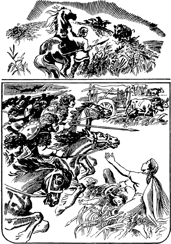 А коли спалахнули крайні хижі, дикі, пронизливі крики вирвали огнищан зі сну, вирвали і вжахнули. Та якщо бог не захотів перепинити ворогам шлях, то що могли вдіяти люди? Тільки Брич устиг схопити меча і вимахував ним біля порога з таким завзяттям, що з десяток печенігів не могли з ним впоратись. Росько, було, кинувся йому на поміч, але той відтурив хлопця: — Тікай звідси, я їх затримаю… Швидше, швидше!.. Рід тобі наказує… Росько від гніву й образи не міг вимовити й слова, лише заперечливо хитнув головою: «Ти ж не нашого роду. Чого тоді мені наказуєш? Хочу разом з родовичами проти ворога з мечем стати… Нехай і загину…» — І уже вивернувся з-під печенізької шаблі. Брич знову крикнув, та не грізно, а розпачливо: — Швидше, Росько! Рід не повинен загинути весь, чуєш!.. Біжи за хижу і в яр. Я їх затримаю!.. І Росько послухався, бо вдарило його оте розпачливе: «Рід не повинен загинути весь». Від хижі падала в багряну ніч велика тінь, яка накрила його. За ним метнувся вслід печеніг, але Брич дотягнувся до нього мечем, і той упав навзнак. Та й Брич не встиг обернутися, і кілька печенізьких шабель зійшлося над його головою. Росько прикрив голову руками, наче на нього падали ті шаблі, і покотився схилом у мокру темряву яру… Довго лежав, віддалений від того світу, де палахкотів вогонь, і ніч роздирали волання людей. …Нічого не залишилось від весі його роду, навіть дим розвіявся. Світило сонце, але він його не бачив. Та й навіщо воно йому? Що шукатиме при його світлі? І все ж бродив селищем, наче сподівався щось надибати. Нема нікого і нічого, жодного звуку, жодного шерхоту… Нема і виходу звідси… То, може, він його шукає? Коли ж побачив чорну смугу, що тягнулася від селища і роз’їдала степ, пішов нею. Пішов, бо тут пройшов його рід, бо нею повели в Дике поле його родовичів. Пішов, бо більше нікуди було йому податися. Знав, що всіх їх чекає жахлива доля, але краще він розділить її з ними… То був просто інстинкт крові, поклик роду. І він вів хлопця Диким полом. І вдень, і вночі… Орда рухалась швидко, часто змінюючи напрям, недовго затримуючись лише біля річок та джерел. Часто натрапляв Росько на ще теплий попіл та бачив на пагорбах вершників. То печенізька сторожа оглядала небокрай, чи не видно русів, чи не спорядили погоню… Та нема кому поспішати на поміч огнищанам: боги забули про них, а князям та боярам навіщо вони, невпокорені й уперті. Не схотіли схилити голови, шукали волі, ото й мають її вдосталь. Широкі степи у них перед очима, гуляй поглядом по них, хоч захлебнися у тій волі — ніхто не заборонить. От лише підвестись та піти не вдасться, бо ж зв’язані… А там зупиняться улуси за порогами, де їх уже ніхто не досягне, й чекатимуть купців-греччинів або ж варягів, хозари теж охоче купують русів, бо міцні й ремеслом усяким володіють. А що непокірні, то пусте, нагайка та кайдани остудять найзавзятішого. Хан Куря думає про це і вдоволено мружиться. Цього року він уперше повів свої улуси в руську землю і захопив багату здобич, спалив на цьому березі всі поселення русів, а полону узяв майже стільки, скільки воїнів має. Звідси, з високого могильника, добре їх видно, бредуть, зв’язані й налякані, а його воїни підганяють їх нагаями. «Так їх, так… — крізь зуби цідить хан. — Лупцюйте дужче, щоб їхній зойк не вмовкав, щоб лунав по всіх степах. Нехай знають вороги, який несамовитий і грізний х