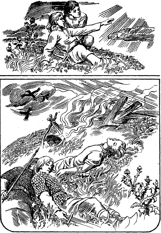Селище зустріло Роська сторожкою тишею. Інколи увірветься в неї тупіт копит, промчить на запаленому коні котрийсь із огнищан, здибить його біля свого дворища, сам теж задиханий і стривожений. Та забіжить до хижі, вхопить щита й списа — і уже хода тверда, впевнена, а вигляд рішучий. Ще озирнеться, махне рукою своїй ладі, яка стоїть на порозі й пригортає до себе малих чад, і подасться до річки… Роськові теж поспішати б туди, а він зупиниться раптом посеред дороги, закине догори голову і вдивляється в небо, мовби чогось очікуючи або ж вишукуючи в ньому… Птахи літають там, і крила їхні зблискують у сонячному мерехтінні. Шугають вгору-вниз, ніби викупуються в сяючому мареві. Жаринки вогню осідають на пір’їнах, а вони своїм стрімким летом роздмухують їх. Ось-ось, здається, спалахнуть і гарячими грудками впадуть у трави, випалюючи їх. От якби й справді ті птахи стали жаринками, впали на тих варягів, пропекли б наскрізь шоломи та лодії, щоб тільки попіл залишився. Та й той змила, забрала б з собою вода… Або засісти у верболозах на березі, взяти клоччя, намотати на стріли і — в ті лодії, одна за другою, щоб тільки свистіло й палахкотіло… Несла б їх річка темної ночі, а вони горіли б, мов купальські вогні. І виходили б люди, які живуть у весях на її берегах, дивувалися і раділи. А ще казали б: «Нехай не бродять ці варяги по чужих землях, не гострять зуби на людське добро. Забаглося їм наших медів посмакувати, а тепер воду п’ють, ніяк не нап’ються…» Хтось згадає і його, Роська з огнищанського роду, і дівчата складуть про нього веселу співанку. І заводитимуть її в час вечірньої зорі, погідної пори. І їхні голоси кудись заманюватимуть, заманюватимуть… Вестимуть понад берегом, у заросяні луки… Літана теж співатиме, і в дзвінкому її голосі вчуватиметься сум. Потім вона притишено розказувала б про те, як острах проймав її, коли він пускав стріли і палив оті варязькі лодії, як серце рвалося до нього, і ледь не вистрибнуло з грудей. Може, й мати почула б про нього, бо ж пісні літають скрізь, мов вітер… Усе це привиділось Роськові так виразно, що він увесь напружився, перехопив до рук лука, натягнув тятиву, і вона відгукнулася тонким дзвенінням. Спробував сильніше, потім ще і ще, аж пучки пальців затерпли. І щоразу з тятиви зривалися різкі звуки, мовби лук і справді перейнявся його нетерпінням і постогнував, тремтів… Звуки падали попереду, аж наче вибивали лунки в теплій пилюці, і хлопець біг за ними навздогінці. Перестрибнув через струмок у виярку, видерся на косогір і завмер у здивуванні та жахному передчутті… Від лісу, десь з-під самого червоного світла, котилася хмара. Здавалося, що то сонце, торкаючись землі, дерев, перепалює їх на попіл і вітер жене його до берега. З цього мороку, збиваючись і викручуючись, тягнулися догори довгі віхті. Сонячні промені торкалися їх і самі ставали чорними. Від цього споглядання в душі молодого воїна наростало тремтіння, як ота напнута тятива. І були в цьому тремтінні радість і захоплення: «Це віщун вмилостивив Перуна, і він наслав на варягів своїх духів у подобі чорної хмари… Це добрий знак…» Придивлявся пильніше, ніби й справді міг угледіти білу постать у цьому вируванні. Та сталося зовсім несподіване і негадане, бо з темних потоків вихопились схарапуджені коні. Вилетіли, мов чорні блискавиці… Позаду них торохкотів і підстри