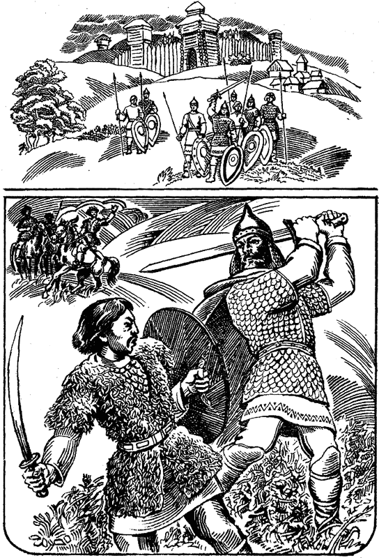 Та ось ворухнувся хтось, повільно підвівся — це був Перегудя. Обвів очима місце поєдинку, знайшов уламок свого меча, довго йшов до нього, потім підняв, стиснув у руці й підняв над головою. І радісним криком вітали його перемогу руська дружина, київський люд на вежах града. А Перегудя дивиться на хана. Втома гне його донизу, рани вогнем печуть, але він тримається рівно, в очах іще жевріє завзяття: — Не збороти, степовий хане, нашої сили! То що, триматимеш своє слово чи будемо битися? Чого мовчиш?.. — Обернувся до Роська: — Гей, отроче, втлумач його по-їхньому!.. Молодий огнищанин умить опинився поруч з тисяцьким і переказав його слова ханові. А сам аж пританцьовує, обпікає степовика поглядом. Почувши слова руського воєводи, Куря ледь утримався на коні. Схопився за свою криву шаблю. Та щось ніби під руку штовхнуло, бо зірвав її з пояса і кинув у траву. — Відступлю од Києва!.. Піду в степи, не буду більше воювати Руської землі… Від цих слів присмиріли печеніги, їх ніби і менше стало, бо збилися докупи. Тільки очима поблискують, а в них і невдоволена жадібність, і затаєний острах перед гострими мечами русичів. Росько теж дивився на кочівників, переводив погляд з одного на іншого, сподіваючись натрапити на знайоме обличчя. Але хіба ж відшукаєш у такому товпись-ку того молодого степовика, з яким звела його лиха доля у ковиловому Дикому полі? Усі вони були однакові: вилицюваті, вузькоокі, з плескатими носами. Хотів покликати, уже й слова зібрав. Були вони не злі, а швидше гіркі й докірливі: «Де ти, Ільк? Навіщо приходив на мою землю? Чому не послухав свого батька? Я ж переказував тобі його волю в нічному степу, біля згасаючого вогнища. Бачиш, яка навколо мене сила. Не здужати вам нас, бо стоїмо на своїй землі! Озовися, Ільк! Я не хочу, щоб розійшлися ми ворогами, щоб затаєна лють гризла наші серця і носили ми на вістрях мечів смерть один одному». Може, й покликав би, але Куря здибив коня, розриваючи йому вудилами губи, аж рожева піна впала на траву, загорланив щось гнівливе й погрозливе. Печеніги у відповідь загалайкали, але врізнобій і зовсім не грізно, ударили коней, зірвали їх з місця і зникли згодом, мов крізь землю провалились. Тільки ще довго там, де починався битий шлях, клубочилась хмара куряви, нагадуючи про грізну небезпеку, якої уникли кияни. А з града назустріч княжій дружині вже йшли люди, сміялись і плакали, обіймали воїнів. Княгиня Ольга, хоч і квола, теж вийшла аж до брами. Стояла, обіпершись на палицю, оздоблену коштовним камінням, в оточенні бояр і челяді. В очах задума і тривожне очікування. Тільки одна вона дивилася у той бік, до попід обрієм ще диміла хмара куряви. Стара володарка ніби передчувала, що Руській землі ще доведеться зазнати багато лиха. Ще не раз топтатимуть пожні копита диких кочівників, палатимуть у пітьмі нічній хижі русичів, мов велетенські смолоскипи, кропитимуть невтішними слізьми степові шляхи бранці. Але бачила вона і руські полки, що стіною стають на захист свого краю… Воїни побачили княгиню і рушили до неї. А біля брами — вир людський. Гамірно, голоси сплітаються, і радісний сміх перекочується у натовпі, Росько йде поруч з тисяцьким. Той тримає руку на його плечі, інколи спотикається і важко навалюється на хлопця. Кияни вклоняються Перегуді, величають його богатирем усіх руських земель. Про хлопця, який крокує поруч з ним, пе