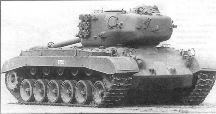 Следом за заказом на Т29 последовал заказ на тяжелый танк T30. На нем планировалась установка более мощного двигателя воздушного охлаждения и 155-мм пушки Т7, способной не только бороться с танками, но и очень эффективной против долговременных укреплений. С проектированием этих машин не торопились, так как Т26, на базе которого они создавались, еще не был окончательно готов. Становилось ясно, что скоро они на вооружение не поступят, а танк, способный бороться с «Королевским тигром», хотелось иметь побыстрее. Работа над различными модификациями Т26 показала, что возможности его ходовой части позволяют или нарастить броню (Т26Е5), или усилить вооружение (Т26Е4). Поэтому родилась идея получить новый тяжелый танк, установив башню с толстой броней и мощным вооружением на удлиненный корпус М26, снабженный моторно-трансмиссионным отделением от Т29. Такой гибрид можно было изготовить достаточно быстро. В феврале 1945 года компания «Крайслер» получила заказ на такую машину под индексом Т32. Несмотря на то, что окончание войны в Европе вызвало падение интереса к тяжелым танкам, опытные экземпляры Т29, T30 и Т32 решено было все-таки воплотить в металле. Первым стал Т32 — наиболее близкий к М26. (Все тяжелые танки Т29, T30 и Т32 строились на «Детройт танк арсенале».) Два танка Т32 поступили на испытания в начале 1946 года. Новый танк имел удлиненный корпус и ходовую часть, увеличенную на один опорный и один поддерживающий катки. В гусеницах использовались такие же траки, как на Т26Е5 — уширенные до 710 мм. В моторном отделении находился двигатель «Форд» GAC мощностью 750 л.с. На Т32 была установлена новейшая двухпоточная гидромеханическая трансмиссия типа «кроссдрайв» ЕХ-120, которая после доработок была принята в серийное производство под индексом CD-850. Эта очень удачная трансмиссия применяется на различных машинах до сих пор. Но главное, чем отличался Т32,— более сильное вооружение и бронирование. Мощная пушка Т15Е2 стояла в башне с толщиной маски 280 мм, а толщина лобовой части башни составляла 203 мм. Лобовая часть корпуса имела толщину 127 мм и угол наклона 54° (больше, чем у «Першинга»). Толщина борта корпуса — 101,2 мм. Следующие два танка Т32Е1, изготовленные к лету, вместо литой лобовой части имели катаную бронеплиту (из-за этого помощник водителя лишился своей пулеметной установки). Однако испытания не показали каких-либо значительных преимуществ катаной брони перед литой, и американцы надолго отказались от ее применения на своих танках. Такой вывод противоречил советскому опыту танкостроения — у нас литая броня значительно уступала катаной. Например, на ИС-2 литую лобовую часть корпуса заменили сварной из катаной брони именно для повышения снарядостойкости. Но никакого парадокса здесь нет: просто советская литая броня в те годы была хуже качеством, чем американская. А литье имело большие преимущества, позволяя убрать сварные швы из мест наиболее вероятных попаданий. Кроме того, это позволяло легко менять толщину брони на протяжении борта (экипаж американцы всегда защищали лучше). А в дальнейшем в США вообще стали делать корпуса новых танков из цельной отливки.