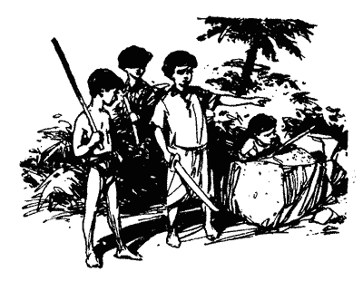 Вранці все село було збуджене й перелякане. Спроба пограбувати, та ще й удень, просто приголомшила всіх його мешканців. Особливо ж непокоїло людей те, що нікого з грабіжників не пощастило впізнати. — Це були якісь волоцюги з сусіднього села, — твердив дехто з жінок. — Але чого ж тоді мати сільського сторожа каже, що один із грабіжників дуже схожий на Дангадасу, а другий — на Упалі? — спитала якась жінка. Упалі Гінівелле — так звали мене. Ім'я Джінни не називалось; його, мабуть, ніхто не впізнав. Хоч як там було, а батько з мачухою поки що не збирались мене карати, бо не дуже вірили словам старої, — відомої брехухи. Проте якби вони побачили мою нараменну пов'язку, то відразу переконались би, що я таки винний, і суворо б мене покарали. — Чого від твого саронга одірвано такий клапоть? — спитала мачуха в Джінни. — Я зачепився за пліт, — відповів мій друг. Мачуха, звичайно, йому не повірила. Однак їй і на думку не спало, що подертий саронг має щось спільне з участю Джінни в пограбуванні. Втім, після тієї пригоди, що набула великого розголосу, батько з мачухою стали дивитись за нами значно уважніше. Особливо підозріливою була мачуха. Шість чи сім днів наші ігри були найневинніші: ми гуляли в палички, дерев'яні кульки, схованки. А через два тижні батько з мачухою забули про ту пригоду. Сторож більш не погрожував нам страшними карами, а його стара мати, зустрівши кого-небудь з нас, навіть привітно усміхалась. І наша ватага знову взялась за свої витівки. Кілька днів поспіль ми, ховаючись у кущах біля дороги, стріляли з рогаток у перехожих, раді-радісінькі, коли селянин, в якого влучав камінець, зойкнувши, хапався за ногу чи бік, потім спантеличено озирався, марно обшукував кущі і, лаючи на всі заставки сільських хлопчаків, ішов далі. Якби бодай один з потерпілих дізнався, що я теж стріляв з рогатки, він одразу б поскаржився моєму батьку, і мені було б не з медом. Одного разу в неділю надвечір, коли ми сиділи в своєму гайку, хтось із хлопців запропонував погратися в мисливців. Усі погодились. Ми скинули саронги, позгортали їх і пообв'язувались ними, як це робили люди за давніх часів. Потім посплітали пояси, на голови начепили вінки з листя хлібного дерева 1 поробили собі луки. У мене лук вийшов довгий і тугий, стріли для нього я нарізав з бамбука. В інших хлопців луки були коротші за мій, а стріли вони поробили з стрижнів листя кокосової пальми. Скинувши сорочку, я почепив свій лук через плече. Інші хлопці зробили так само.