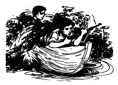 Я теж зовсім виснажився і ледве витягав своє весло з води. Таємничий човен проминув скелі і став віддалятись від нас. Ми ще змогли роздивитись, що в ньому сидить жінка і хлопчик. Веслувала жінка. Ми гукнули до них, щоб вони зупинились, але їхній човен пішов ще швидше.