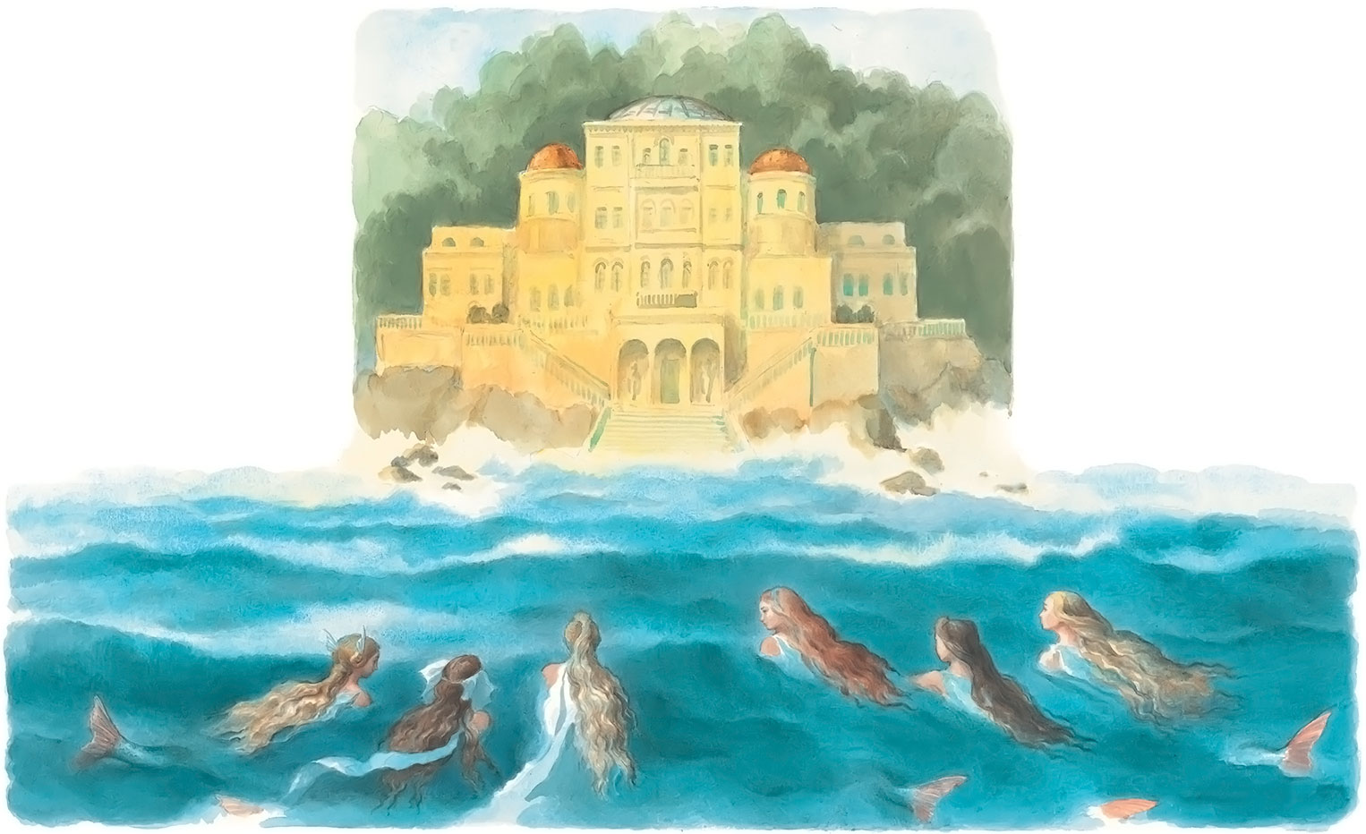 В открытом море вода совсем синяя, как васильки, и прозрачная, как чистое стекло, – но зато и глубоко там! Так глубоко, что ни одной цепи не хватит, чтобы достать до дна; а чтобы измерить эту глубину, пришлось бы громоздить друг на друга невесть сколько колоколен. Вот там-то и живут русалки. Не подумайте, что там, на дне, один голый песок, – нет, там растут невиданные деревья и цветы с такими гибкими стеблями и листьями, что они шевелятся, как живые, при малейшем движении воды. Между ветвями шныряют рыбы – большие и маленькие, – точь-в-точь как у нас птицы. В самом глубоком месте стоит коралловый дворец морского царя с высокими стрельчатыми окнами из чистейшего янтаря и с крышей из раковин, которые то открываются, то закрываются, смотря по тому, прилив или отлив; это очень красиво: ведь в каждой раковине лежит такая сияющая жемчужина, что она одна украсила бы корону любой королевы.