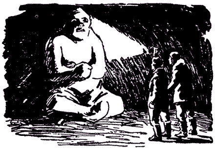 Промінь світла заметався в мороці і раптом вирвав з пітьми гігантську потворну голову. В мене аж мурашки побігли по спині. Промінь повільно поповз униз. Голова зникла в пітьмі, зате я побачив масивний тулуб із складеними на животі руками.
