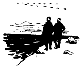 На шляху до поварні ми перейшли сніжник; у мене було таке відчуття, що цей сніжник — частина зненацька застиглого озера: дув вітер, ходили хвилі, а потім, мов за помахом чарівної палички, озеро замерзло, і хвилі завмерли з піднесеними вгору гребенями… Налякані вертольотом ховрашки повилазили з нірок і тривожно пересвистувались, поглядаючи на нас…