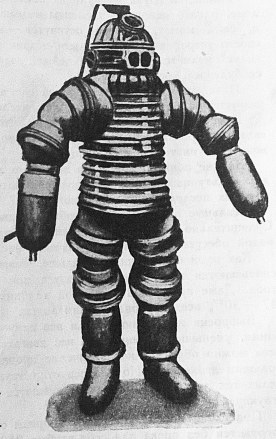 Кстюмы делаются броневые, наружное давление поглощается жесткостью системы. (Рис. 1 и 2). Для дыхания водолаз имеет сзади резервуар со сжатым кислородом и получает требующийся кислород при помощи особого приспособления. Поглощение углекислоты достигается аппаратом, находящимся внутри водолазного костюма. Передвижение в таком костюме и на такой глубине весьма затруднительно, и водолаз переводится с одного места на другое с помощью стрелы (приспособление на корабле, с которым водолаз связан, обычно, стальным тросом), по указанию самого водолаза, соединяющегося с верхом телефоном. Таким образом, автономные водолазные костюмы для работ на больших глубинах невозможны, в виду их большого веса и трудности самостоятельного продвижения по дну на этих глубинах; на глубинах же небольших, автономность приборов ограничена незначительной продолжительностью действия аппаратуры с кислородом и для поглощения углекислоты.