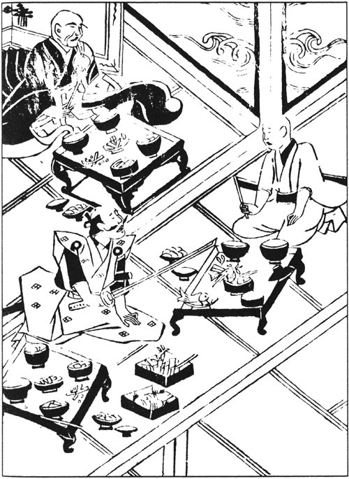 Для гостя в чашу положили сладостей, наполнили её водой и установили на подставке. Иккю внёс всё это в комнату, а высокий гость сказал: «Послушник, упустишь ведь!» Только он это сказал, Иккю с грохотом уронил подставку посреди комнаты; чаша, вода — всё полетело в разные стороны.