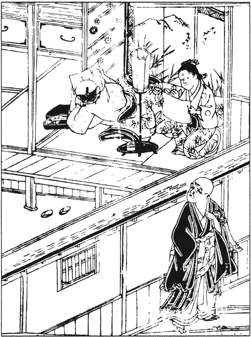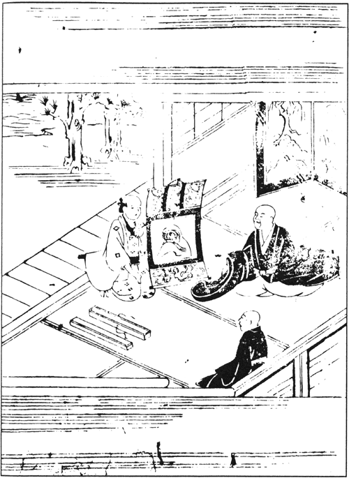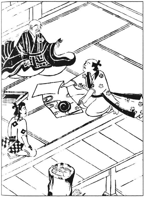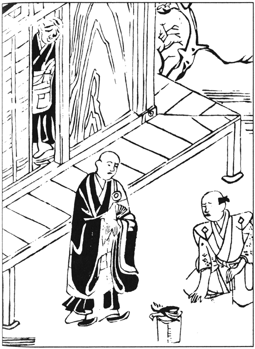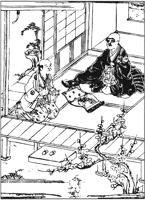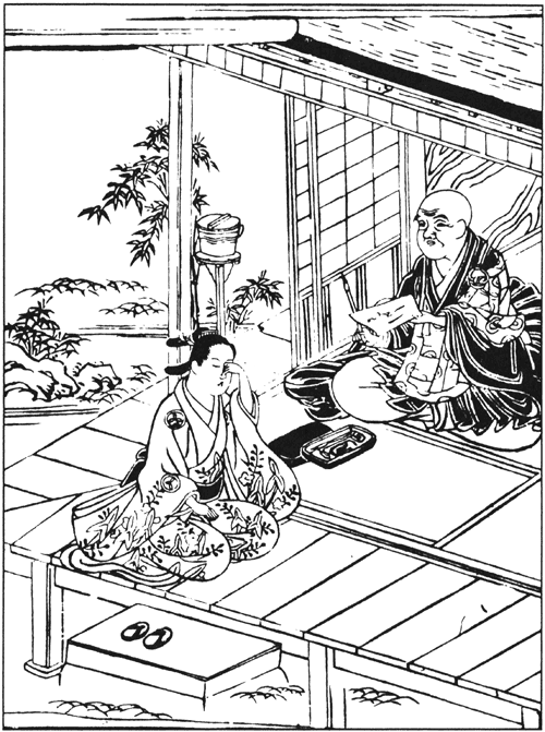 Преподобный Иккю временами бывал в деревне Такиги[379] близ Нара. В деревне неподалёку жил мирянин по имени Сёсаэмон, который стремился к обретению дзэнской мудрости. Постепенно постигал он благодать проповедей, искал истины в практиках дзэн, а когда узнал, что знаменитый Иккю обретается поблизости, захотел с ним встретиться и постоянно об этом думал, и как-то пришёл наконец к нему, постучал в дверь, а преподобный спросил: — Кто там? — Мирянин, взыскующий совершенствования в Учении Будды! — отвечал Сёсаэмон. Иккю тут же спросил: — И что такое Учение Будды? — а Сёсаэмон сказал:
