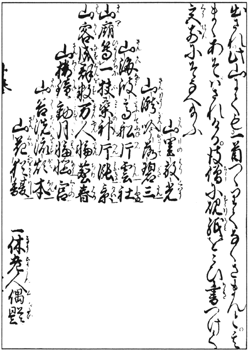 Монах предложил: «Давайте на этой горе сложим по стихотворению!» — и принялись они сочинять стихи. Иккю попросил у того монаха тушечницу и бумагу и преподнёс божествам написанные им строки.
