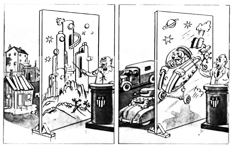 «Попюлер Сайенс» сообщает, что в Массачусетском технологическом институте — учреждении вполне земном (достаточно сказать, что в его стенах велись и ведутся работы, связанные с атомной бомбой) сейчас «проектируются и конструируются предметы, предназначенные для торговли в межпланетном и даже межзвездном масштабе», и что такая торговля «может начаться хоть завтра». В стенах института выдумана некая планета Метания, входящая якобы в систему Арктура, выдуманы необычайные условия, якобы существующие на ней (сила тяжести в 10–12 раз больше земной, атмосфера из метана и аммиака, чрезвычайно низкие температуры и т. д.), и двадцати лучшим студентам различных специальностей предложено сконструировать из земных материалов утварь и механизмы, пригодные для жителей этой гипотетической планеты. Смехотворная игра развертывается на полном серьезе. Сочинены дневники, письма и отчеты о последнем посещении Метании, происшедшем в 2951 году, придуман внешний облик, язык и быт метанийцев. сочинены их история, география, техника, архитектура, — словом, сделано все, чтобы они показались «всамделишными». По мысли своих создателей, метанийцы пользуются шестеричной системой исчисления и письменностью, не имеющей ничего общего с земной. Трава на Метании растет верхушками в почву, а корнями в воздух, все мышечные и нервные реакции у метанийцев протекают очень замедленно, а дети их выводятся из яиц, которые матери долго таскают с собой в портативных инкубаторах… Всех странностей не перечесть. Пытаясь представить выдуманные существа понеобычайнее, авторы игры допускают подчас ляпсусы. Сочиняя своих метанийцев. профессора института присвоили им третий глаз, «с рентгеновским зрением», хотя, как известно, для зрения требуется сведение лучей в фокус, а для лучей Рентгена это-то и невозможно. Премудрые профессора, старающиеся возможно полнее отвлечься от земных условий, «отвлечены» и от азбучных истин физики. «Попюлер Сайенс» восторженно заявляет, что «метанийская проблема» заставляет студентов полностью использовать все свои технические знания и навыки и что только такую работу «можно назвать подлинно творческой». Нам, советским людям, дико даже представить себе, что нужно выдумывать мебель для метанийцев, когда в США бродят целые армии людей, лишенных не только мебели, но и крова, что можно изобретать портативные инкубаторы для метанийских матерей, когда реальные американские дети вырождаются и гибнут физически и духовно; что можно изобретать метанийские автомобили и в то же время закрывать реальные автомобильные заводы «из-за нехватки сырья» (хотя, к слову сказать, для военных заказов сырья всегда хватает). Неужели профессора Массачусетского технологического института всерьез думают, что вокруг них все окончательно приведено в порядок и научной мысли остается только искать себе применения на других планетах? Мы знаем, что в их стране далеко не все в порядке даже с технической точки зрения. Почва разъедается беспощадной эрозией, обрекающей ежегодно тысячи фермеров на нищету и бродяжничество; рядом с бурными, все затопляющими реками простираются засушливые земли, взывающие об орошении, в гористых местностях шумят водопады, бесполезно тратящие многие и многие киловатты энергии, во многих местах без пользы пропадают запасы ценных ископаемых