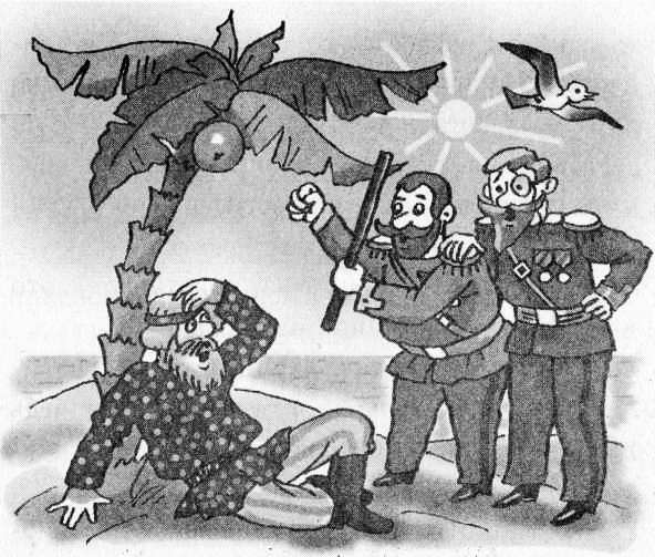 — Генералы только приставуху… то есть приставку с собой взять успели, — продолжал Оклахомов. — А на необитаемом острове ни пирожковой, ни блинной, даже буфета нет! А генералы голодные, есть хотят. Но ни на пальму за бананами забраться не могут, ни рыбу поймать, ни рябчика. Вот они и выбрали в игре мужика.
