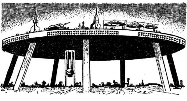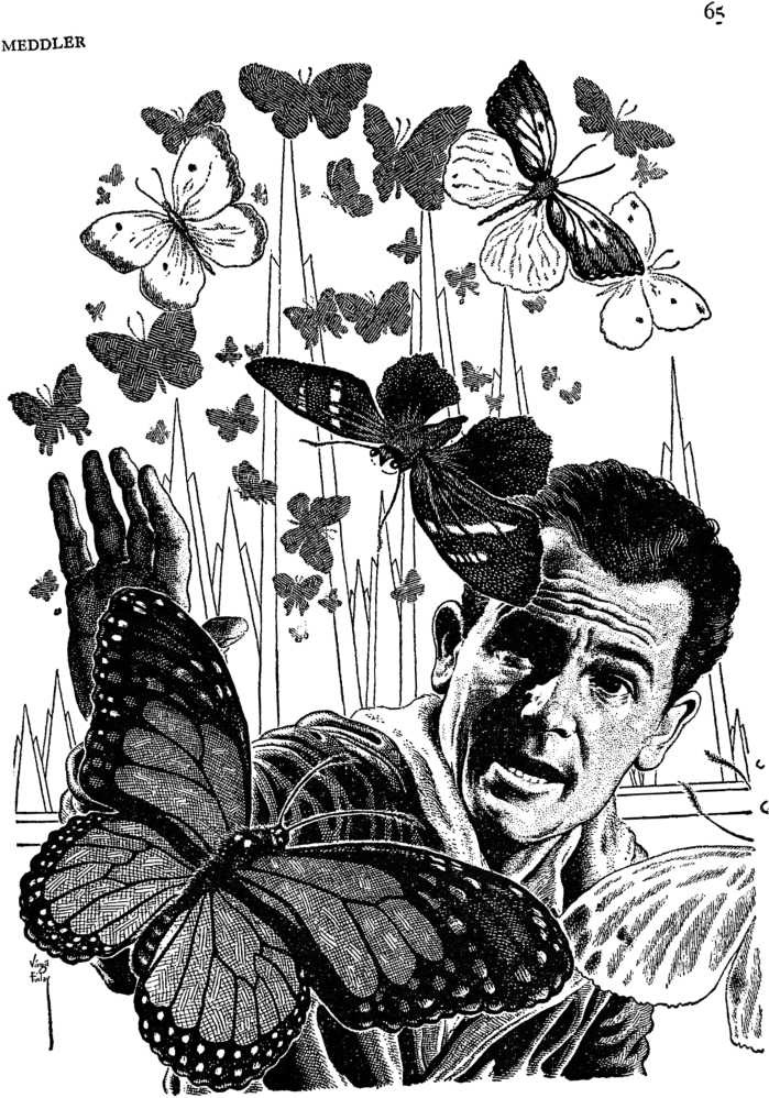 Hasten looked around him. It was cold in the sphere; the air was thin and chilly. He watched the moving dials for awhile, but presently the cold began to make him uncomfortable. He went over to the equip- ment-locker and slid the door back. A jacket, a heavy jacket, and a flash gun. He held the gun for a minute, studying it. And tools, all kinds of tools and equipment. He was just putting the gun away when the dull chugging under him suddenly ceased. For one terrible second he was floating, drifting aimlessly, then the feeling was gone. Sunlight flowed through the window, spreading out over the floor. He snapped the artificial lights off and went to the window to see. Wood had set the controls for a hundred years hence; bracing himself, he looked out. A meadow, flowers and grass, rolling off into the distance. Blue sky and wandering clouds. Some animals grazed a long way off, standing together in the shade of a tree. He went to the door and unlocked it, stepping out. Warm sunlight struck him, and he felt better at once. Now he could see the animals were cows. He stood for a long time at the door, his hands on his hips. Could the plague have been bacterial P Air- carried? If it were a plague. He reached up, feeling the protective helmet resting on his shoulders. Better to keep it on. He went back and got the gun from the locker. Then he returned to the lip of the sphere, checked the door-lock to be certain it would remain closed during his absence. Only then, Hasten stepped down onto the grass of the meadow. He closed the door and looked around him. Presently he began to walk quickly away from the sphere, toward the top of a long hill that stretched out half a mile away. As he strode along, he examined the click-band on his wrist which would guide him back to the metal sphere, the Time Car, if he could not find the way himself. He came to the cows, passing by their tree. The cows got up and moved away from him. He noticed something that gave him a sudden chill; their udders were small and wrinkled. Not herd cows. When he reached the top of the hill he stopped, lifting his glasses from his waist. The earth fell away, mile after mile of it, dry green fields without pattern or design, rolling like waves as far as the eye could see. Nothing else? He turned, sweeping the horizon. He stiffened, adjusting the sight. Far off to the left, at the very limit of vision, the vague perpendiculars of a city rose up. He lowered the glasses and hitched up his heavy boots. Then he walked down the other side of the hill, taking big steps; he had a long way to go. Hasten had not walked more than half an hour when he saw butterflies. They rose up suddenly a few yards in front of him, dancing and fluttering in the sunlight. He stopped to rest, watching them. They were all colors, red and blue, with splashes of yellow and green. They were the largest butterflies he had ever seen. Perhaps they had come from some zoo, escaped and bred wild after man left the scene. The butterflies rose higher and higher in the air. They took no notice of him but struck out toward the distant spires of the city; in a moment they were gone. Hasten started up again. It was hard to imagine the death of man in such circumstances, butterflies and grass and cows in the shade. What a quiet and lovely world was left, without the human race! Suddenly one last butterfly fluttered up, almost in his face, rising quickly from the grass. He put his arm up automatically, batting at it. The butterfly dashed against his hand. He began to laugh — Pain made him sick; he fell half to his knees, gasping and retching. He rolled over on his face, hunching himself up, burying his face in the ground. His arm ached, and pain knotted him up; his head swam and he closed his eyes. When Hasten turned over at last, the butterfly was gone; it had not lingered. He lay for a time in the grass, then he sat up slowly, getting shakily to his feet. He stripped off his shirt and examined his hand and wrist. The flesh was black, hard and already swelling. He glanced down at it and then at the distant city. The butterflies had gone there . . . He made his way back to the Time Car. Hasten reached the sphere a little after the sun had begun to drop into evening darkness. The door slid back to his touch and he stepped inside. He dressed his hand and arm with salve from the medicine kit and then sat down on the stool, deep in thought, staring at his arm. A small sting, accidental, in fact. The butterfly had not even noticed. Suppose the whole pack — He waited until the sun had completely set and it was pitch black outside the sphere. At night all the bees and butterflies disappeared; or at least, those he knew did. Well, he would have to take a chance. His arm still ached dully, throbbing without respite. The salve had done no good; he felt dizzy, and there was a fever taste in his mouth. Before he went out he opened the locker and brought all the things out. He examined the flash gun but put it aside. A moment later he found what he wanted. A blowtorch, and a flashlight. He put all the other things back and stood up. Now he was ready — if that were the word for it. As ready as he would ever be. He stepped out into the darkness, flashing the light ahead of him. He walked quickly. It was a dark and lonely night; only a few stars shone above him, and his was the only earthly light. He passed up the hill and down the other side. A grove of trees loomed up, and then he was on a level plain, feeling his way toward the city by the beam of the flashlight. When he reached the city he was very tired. He had gone a long way, and his breath was beginning to come hard. Huge ghostly outlines rose up ahead of him, disappearing above, vanishing into darkness. It was not a large city, apparently, but its design was strange to Hasten, more vertical and slim than he was used to. He went through the gate. Grass was growing from the stone pavement of the streets. He stopped, looking down.