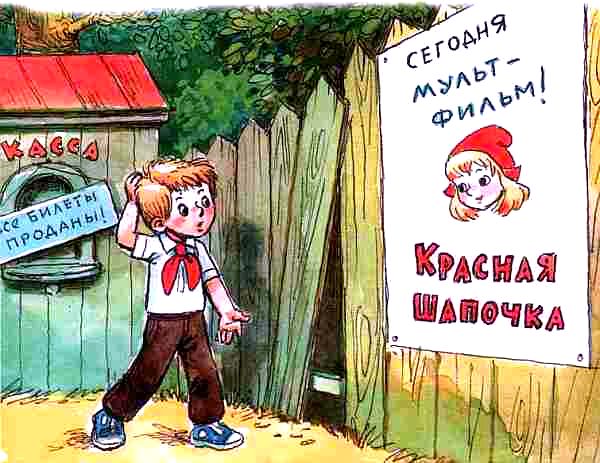 Больше всего на свете Петя любил сказки. Ну, и что тут такого? Все мальчишки любят сказки, только почему-то стесняются в этом признаваться. Можно подумать, сказки только для одних девчонок пишутся. Самыми любимыми были у Пети сказки Шарля Перро. А «Красную Шапочку» он уже давно знал просто наизусть! Однажды Петя гулял в городском саду и вдруг увидел афишу: «Сегодня мультфильм! «Красная Шапочка»». Петя даже подпрыгнул от радости и скорее побежал к кассе летнего кинотеатра. Но на кассе было написано: «Все билеты проданы!» Петя чуть не заплакал от досады и сердито пнул ногой забор, которым был огорожен кинотеатр. Будто забор был виноват в том, что в кассе нет билетов.
