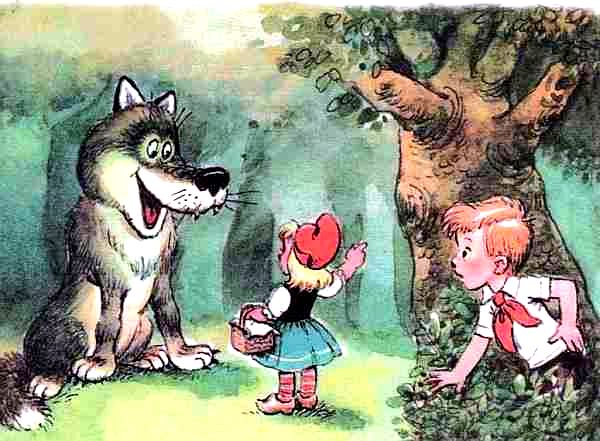«Наверное, я попал на сцену театра, а не на мультик, — подумал Петя. — Тогда, значит, лес — это декорации, а Красная Шапочка — артистка». Но тут из-за «декораций» на полянку выскочил настоящий волк и очень натурально облизнулся, обнажив длинные и острые клыки.