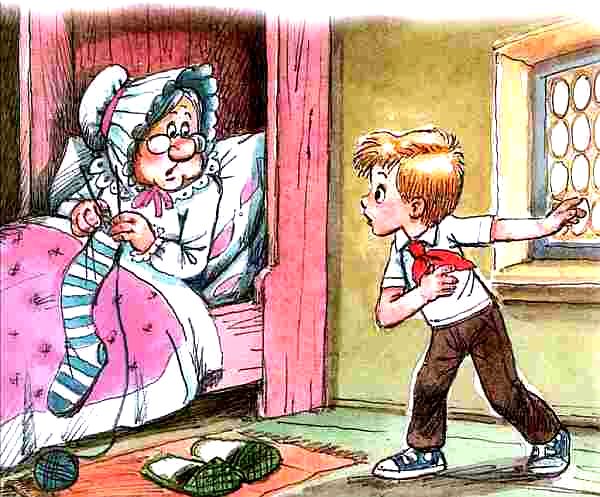 Бабушка, как и положено было ей по сказке, лежала в кровати и вязала чулок.