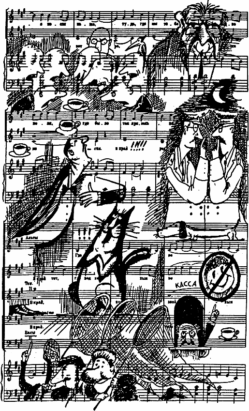 Случался ли у Бесноватого сердечный приступ или нет, оркестрантам так выяснить и не удалось. Кто-то в театре обрадовался, кто-то загрустил — но Абдулла Урюкович, живой и невредимый, на следующий день, как ни в чем не бывало, явился репетировать с оркестром. «Арфы, вы что там играете?! В Японию ехать не хотите?!. …Медь, громче! Контрабасы, маркато!.. Всем смычком, шакалы!..» — неистово орал он во время репетиции, не останавливая оркестр. В это время Антон Флаконыч Огурцов, баритон Барабанов и потомственный певец Лапоть Юрьев, вооружившись большими сачками и растянувшись в цепь, шли по нижнему оркестровому фойе. В рамках работы отдела художественной безопасности театра они выполняли важнейшую директиву Абдуллы Урюковича. Дело в том, что с некоторых пор приподнятую атмосферу высокого искусства, неизменно царившую на спектаклях и концертах маэстро (да хранит Аллах здоровье и разум его!) стала беспардонно и гнусно профанироваться появлением на сцене огромного и наглого рыжего кота. Усаживаясь на рампе, бесстыжая тварь умывалась, позевывала, потягивалась — и только после того, как все внимание публики обращалось на него, котяра неспешно скрывался в кулисах. Баритон-спортсмен Селезень даже написал в отдел художественной безопасности театра рапорт, в котором обвинил паскудного кота в срыве спектакля «Евгений Онегин». В своем донесении певец жаловался, что возникнув на суфлерской будке (и тем самым изрядно оживив публику) как раз в то время, когда баритон запел: «…примите ж исповедь мою…», кот до поры до времени лишь внимательно прислушивался; однако как только Селезень затянул: «мечтам и годам нет возврата», гадкое животное принялось подпевать баритону-спортсмену ужасным гортанным мяуканьем. Правда, артисты оркестра злословили, что кот лишь подправил певцу интонацию — но шквал оваций, раздавшийся после арии, баритон Селезень разделил с мохнатым злодеем, с комической важностью потешно вставшим на задние лапы.