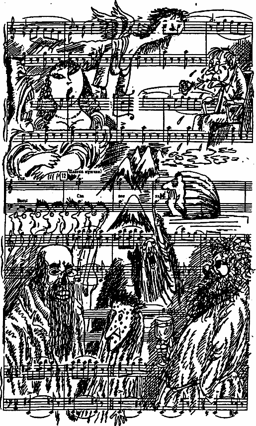 …Акакий Мокеевич Пустов, Моисей Геронтович Шкалик, композиторы Тайманский, Шинкар и Кошмар, критикесса Поддых-Заде, а также критик Шавккель попивали чаек в кабинете председателя N-ского союза христианских творцов консонансов. Точнее говоря, чай пили лишь Шкалик, Тайманский, Шавккель да сам Пустов — все же остальные при этом почтительно присутствовали — причем, из-за дефицита посадочных мест в кабинете, стоя. Акакий Мокеевич, время от времени поднимая со стола хрустальный стакан в серебряном подстаканнике (украшенном якорем и надписью «Боевая слава Севастополя»), делал обстоятельные, неспешные глотки. Моисей Шкалик, часто и мелко прихлебывая, пил чаек, угнездив на крохотной ручонке несолидное блюдечко подросткового размера; перед каждым глоточком он, зажмурясь, усиленно дул на блюдце. Шавккель, сильно оттопырив мизинец, держал чашку несколько на отлете, отдельно от блюдца; он впивал чай редко, но истово и подолгу, подобно невиданному москиту — а оторвавшись, наконец, от чашки, известный критик скорбно и задумчиво жевал губами. Тайманский же, по обыкновению, все подливал себе в чашку дурно пахнущий коньячный спирт из походной фляжки. — Я, собственно говоря, не буду вас больше задерживать; я, пожалуй, позову вас чуть позже… — ни к кому конкретно не обращаясь, проговорил Пустов, — и не занятые чаепитием Шинкар и Кошмар вдруг исчезли из кабинета, будто и не было их здесь — лишь тихонько скрипнула дверь. Затем Акакий Мокеевич обратил свой ласковый взгляд на Зарему Поддых-Заде, чуть было замешкавшуюся; юная критикесса просияла и села на стульчик возле двери. — Ну-с, расскажите-ка нам про новый шедевр! — мягко изрек Пустов в пространство; взоры присутствующих немедленно обратились на Шкалика, тут же поперхнувшегося чайком и визгливо закашлявшегося. — Думал нас вокруг пальца обвести, гнида! — оживился Тайманский, не любивший эвфемизмов. «Ну что вы, право!» — укоризненно прошептал ему Шавккель. — Это… что… Я, в общем, не понимаю… — запричитал Шкалик, проливая чай себе на штанишки. — А понимать здесь особо и нечего, — вновь заговорил Пустов. — Вы, выступив от лица Бесноватого с неофициальным предложением, обещали нам некоторые услуги… Теперь же выясняется, что оперу пишет далеко не самый блестящий московский композитор — для которого, заметьте, нашлись и ячейка в штатном расписании N-ской оперы, и квартира в N-ске, причем в старом фонде… — Это о ком же речь? — спросил Шавккель. — Да Борька Мусоргский, бездарь! — сообщил Тайманский, икнув. — …Сам же Моисей Геронтович тем временем пишет вдохновенные стишки для либретто! — закончил Пустов. — Неправда! — отчаянно взвизгнул Шкалик. В ответ на это Пустов поднял трубку местного телефона и сказал туда несколько слов. Не успел он положить трубку, как в кабинете уже возник композитор Кошмар (родной брат дирижера Кошмара) и, положив на стол Пустова тоненькую папочку, немедленно исчез. «Кошмар донес, иуда!» — мелькнуло в голове у сразу как-то затосковавшего Шкалика. Акакий Мокеевич тем временем неторопливо извлек из папочки на свет Божий несколько мятых тетрадных листков, исписанных крупным ребяческим почерком, и расправив их у себя на столе, принялся читать с выражением, иногда слегка заикаясь:* * *
