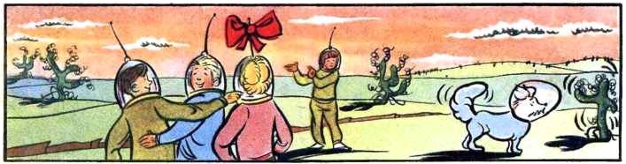 Діти всілися в дивовижний апарат, і цього разу не злинули над підлогою, як при польоті на Місяць. У літаку було штучно створене земне тяжіння, що давало можливість прогулюватися навіть поверхнею великого «капелюха». За два вони вже наблизилися до Місяця.