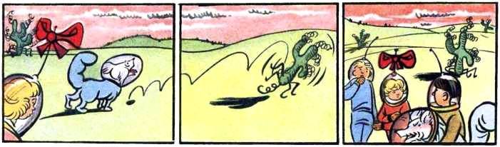 Діти все ще клячали в строкатих заростях. Стрілянина стихла. Ольга втішала рюмсаючу Іренку. Буфик тим часом оговтався. Знову забувши про скафандр, він спробував обнюхати підозрілу кульку, що росла на низькій гілці. Та щойно торкнувся її, як кулька репнула.