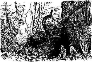 Корабль находился на огромной площади, залитой голубоватым светом. По обеим сторонам тянулись бесконечные вереницы судов различной формы и величины: от мощных военных галер с пушками и митральезами до маленьких рыбачьих лодок. Их подпирали янтарные брусья, и со стороны могло показаться, что это ярмарка или выставка кораблей. Высоко наверху простирался свод, выложенный раковинами, между которыми виднелись круглые отверстия, закрытые янтарными крышками. Площадь, границы которой исчезали в полумраке, была покрыта малахитовыми плитами, а посредине в громадном бассейне весело плескались чернилицы.