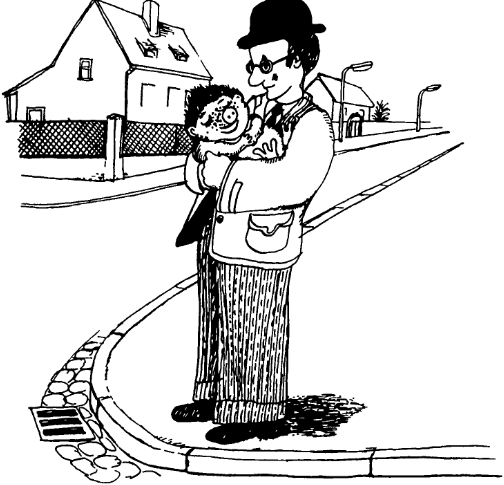— Ніякий я тобі не тато! Моє прізвище — Пляшкер. Я живу он у тому будинку. І дітей у мене немає. Усі про це знають! Будь-хто може це підтвердити! — вигукнув пан Пляшкер. Йому дуже хотілося скинути з себе Суботика. Але той вчепився міцно-міцно і, здавалося, ось-ось заплаче.