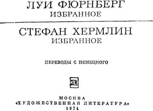 За четверть века своего существования Германская Демократическая Республика вписала в историю немецкого народа главу, исполненную напряженного драматизма, насыщенную пафосом утверждения того нового, что с каждым днем все рельефнее проступало и проступает в социальном укладе, в политической атмосфере, а также в искусстве и литературе молодого государства. Литература, подобно сейсмографу, улавливает важнейшие, иной раз едва приметные сдвиги, происходящие в жизни. Хорошо сказал об этом Горький:«Художник — чувствилище своей страны, своего класса, ухо, око и сердце его; он — голос своей эпохи»[1].Поэты и прозаики ГДР разных поколений — и те, чей талант креп под влиянием битв с реакцией во времена Веймарской республики и в годы господства фашизма, и те, чья юность была искалечена развязанной Гитлером войной, и, наконец, то, чье сознание формировалось в послевоенных условиях, в обстановке, коренным образом изменившейся после разгрома нацистского рейха, — создали немало произведений, в которых звучит голос новой, социалистической Германии. И эти произведения получили признание у множества читателей в самых разных концах света. Перед нами два художника, достойно представляющие передовую немецкую литературу, — Луи Фюрнберг и Стефан Хермлин. Каждый из них по-своему прокладывал путь к социалистическому искусству. Их самобытные, яркие таланты на первый взгляд совсем несхожи. И все же Фюрнберг и Хермлин в чем-то очень близки, родственны друг другу. Обоим присуще предельно острое восприятие того страшного, что принесли с собой гитлеризм и вторая мировая война. Оба познали в юности тяжкое одиночество, на которое обрекает человека собственнический мир, и обоим же в конце концов открылось великое счастье единения с теми силами современности, которые преобразуют жизнь. И Фюрнберг и Хермлин прежде всего лирики. Когда вчитываешься в их произведения (будь то стихи или проза), неизменно ощущаешь: здесь каждая строка выдает присутствие автора. Оба художника пишут о том, что было ими пережито, выстрадано, во всяком случае — захватило их до глубины души. Но даже сугубо личное, интимное неизменно освещено отблеском великих событий нашего времени. В лирических стихах обоих поэтов чувствуется биение пульса народной жизни. Когда обращаешься к строгой, сдержанной, прозрачной прозе обоих писателей, видишь: здесь все говорит об особой взыскательности вкуса, присущей прежде всего поэтам, добивающимся филигранной отточенности фразы, образной выразительности мысли. Сочинения Фюрнберга и Хермлина не составят большого числа увесистых томов, тем не менее вклад этих художников в современное немецкое искусство весьма значителен. Без разносторонней творческой деятельности Фюрнберга и Хермлина (оба они выступали не только как поэты и мастера художественной прозы, но также и как публицисты и критики) нельзя себе представить литературу Германской Демократической Республики.