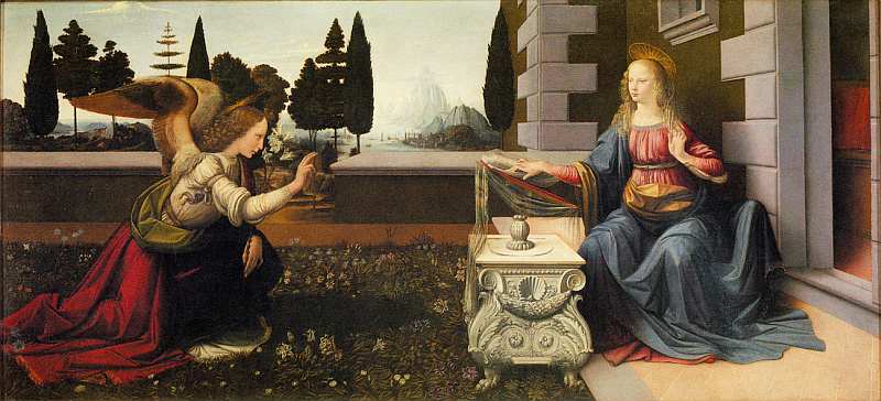 Картина «Благовещение» (1472–1475, Лувр, Париж) написана в самом начале творческого пути живописца. Полотно с изображением Благовещения было заказом для одного из монастырей в окрестностях Флоренции. Однако не все исследователи творчества Леонардо уверены, что оно является полностью самостоятельной работой двадцатилетнего художника. Хотя, впрочем, споры вокруг авторства этой и многих других картин Леонардо — отнюдь не редкость. На деревянной панели внушительных размеров — 98×217 см показан момент, когда архангел Гавриил, спустившийся с небес, сообщает Марии, что она родит сына и назовет Его Иисус. Считается, что в это время Мария как раз читает ту самую часть пророчеств Исайи, где упоминалось о предстоящем свершении. Сцена не случайно расположилась в весеннем саду — цветы под ногами и в руке архангела символизируют чистоту и безгрешность Девы Марии. Да и сам по себе сад, огороженный низкой стеной, традиционно ссылается на образ Богоматери, также обособленной в своей непорочности от внешнего мира. Любопытная деталь связана с крыльями Гавриила. Спустя время неизвестный художник удлинил их в довольно грубой живописной манере. Те же, что изначально задумал Леонардо, остаются различимы — они значительно короче и, вероятно, были срисованы с крыльев настоящей птицы в полете. В «Благовещении», если присмотреться внимательнее, можно обнаружить несколько ошибок в построении перспективы еще неопытным Леонардо. Самая явная — это правая рука Марии, глядя на которую создается впечатление, что она находится ближе к зрителю, чем сама фигура женщины. В драпировках пока нет мягкости, одежды персонажей выглядят слишком тяжелыми и неподвижными, как будто сделаны из камня. Но так учил Леонардо Вероккио. Такими, отчасти угловатыми и резкими, были все изображения художников того времени. Зато позже по пути к обретению живописного реализма Леонардо будет двигаться сам и поведет за собой остальных художников.