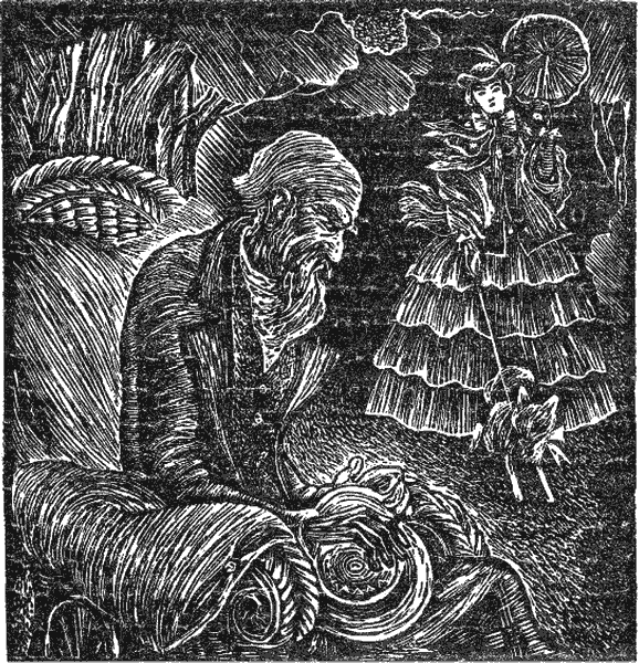 На бульваре, на главной просторной аллее сидел в трехколесном кресле старик. Кресло было поставлено под липу так, чтобы тень защищала голову старика, а ноги его, покрытые одеялом, грело солнце. Старик дремал. Молодой парень, одетый под господского казачка — в плисовых шароварах и безрукавке, в голубой сатиновой рубахе, — сидел неподалеку на садовой скамейке. Изредка он подходил к креслу и подкатывал его поглубже в тень, когда солнечный свет заползал слишком высоко на грудь старика. Прохожих было мало, кое-кто из них кланялся старику, но он не отвечал. Понемногу — от неподвижности зноя и однотонного чириканья воробьев — дремота одолела и парня. Прошло с полчаса. Солнце добралось до головы старика, припекло его, он очнулся, повел вокруг себя прозрачно-водянистыми глазками и вдруг насторожился. По аллее двигалась к нему молодая модница в розовой пене оборок, — под кружевным зонтиком, с беленьким шпицем на шнурочке. Шпиц шел вприпрыжку, подбирая и словно отряхивая лапки, пушистая шерстка на нем подрыгивала, и так же, как шерстка на шпице, с каждым шагом модницы подымались и падали розовые оборки ее платья. Шпиц подбежал к креслу, понюхал одеяло, но шнурочек тут же отдернул собаку, и старик расслышал жеманно протянутые слова: — Ступай, Дэнди, ступай! Голос показался старику истомленным, ленивым, но таким уветливым, что захотелось прикрыть глаза, чтобы подольше удержать в памяти его музыку. — Вася! — крикнул старик, — Василий! Парень спросонок подскочил на скамейке и заученно откликнулся: — Слушаю, Мирон Лукич! — Вези! — быстро приказал старик. — Куда, куда, дурак? — воскликнул он, едва парень начал поворачивать кресло. — Пошел назад. Шибче. Но уже через минуту он опять приструнил Василия: — Чего несет нелегкая? Легше! Кресло катилось по бульвару следом за розовыми оборками, кружевным зонтиком, следом за шорохом шелков и нежным, приторным запахом помады. Мирон Лукич смотрел на модницу. Он никогда прежде не встречал ее, он не видывал, чтобы барыня хаживала вот с этакой озабоченностью — ну, совсем так, будто нельзя потерять ни одной секунды, и — в то же время — словно и неторопливо, без всякой поспешности, так себе — прогуливает мадам своего песика на шнурочке, в этом и заключается вся приятная забота. Ни такой поступи — безыскусной и как-будто хорошо обдуманной, — ни такой руки с зонтиком, ни даже такого зонтика ни разу не попадалось Мирону Лукичу на бульваре, и он все тужился разглядеть получше лицо необычной барыни, и все никак не мог, потому что дурак Васька был сбит с панталыку и не знал, как нужно катить кресло. — Легше! — шипел на него Мирон Лукич. И опять, спустя недолго; — Подгоняй, подгоняй! Заснул! Наконец, перед самым выходом из бульвара, шпиц потянул куда-то в сторону, барыня приостановилась, откинула на плечо зонтик, кресло догнало ее, и тогда, на одно мгновенье, Мирон Лукич увидел пронизанное солнцем маленькое ухо женщины, между двумя тонкими завитушками буклей, под шляпой. Оно просвечивало насквозь и было розовое, розовое, как оборки платья, как зонтик, и завитушки буклей горели мягкой, рыжизною, почти переходившей в розовое, теплое, солнечное. — Поправей, вперед! — совсем тихо приказал Мирон Лукич. Но было уже поздно: шпиц, отряхивая лапки, побежал в воротца, и хозяйка его покинула бульвар, даже не приметив старика в кресле. Тут же, с у