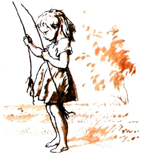 Алёнка вылезла из лужи и сказала: - А вода до чего тёплая! И побежала по улице, по всем лужицам и калужинкам. Таня бросилась за ней. Они догоняли друг друга, шлёпали босыми ногами по воде, поднимали весёлые брызги и смеялись. Вдруг Алёнка остановилась. - Гляди-ка, - сказала она, - пионерский вожатый хворост несёт! Вожатый пионерского отряда Ваня Дозоров услышал Алёнку. - Это не хворост, - сказал он, - это маленькие деревца - липки. Таня подбежала к нему: - Липки! А где же ты их столько накопал? - Не накопал. В лесничестве взял. Там их в питомнике из семян вырастили… - А на что они? - Как «на что»? Сажать будем. Посреди деревни около избы-читальни кучкой сидели ребята-школьники: кто на ступеньках, кто на брёвнышках. У всех были заступы, и солнечные огоньки то тут, то там загорались на отточенных лезвиях. - Ну, идите, - сказал Ваня, - некогда мне с вами! А вон и бригада моя собралась, ждёт меня. В это время школьники увидели Ваню и побежали ему навстречу: - Сад в деревню принесли, сад принесли! Они окружили Ваню Дозорова, разглядывали маленькие деревца, расспрашивали: - А сколько их тут? - А где сначала сажать будем? - Сначала будем сажать вокруг пасеки, - сказал Ваня,- потому что это липка, а пчёлы липовый цвет любят. - А потом где? - А потом по всей деревне насажаем. Разных деревьев насажаем. Сирени побольше. Пускай у нас избы как в саду стоят. - На пасеку так на пасеку! - закричал Вася Бражкин. - Шагай, ребята! - На пасеку! - подхватила Ариша Родионова. Настя вскинула заступ на плечо и первая зашагала по тропочке, ведущей на пасеку. Таня уцепилась за Ванин рукав. - И мы с вами пойдём липки сажать! Ваня засмеялся: - И вы? Да вы же не сумеете! - Сумеем! - сказала Таня. Тут и Алёнка её поддержала: - Мы сумеем! Тогда Ваня дал им два деревца: - Вот. Сажайте. Только на пасеку не ходите, вам далеко. Посадите их где-нибудь у своих дворов. Но смотрите: если не справитесь, позовите кого-нибудь из старших. А саженцы зря не губите - они трудов стоят. И ушёл. Алёнка посмотрела на своё деревцо и сказала: - Разве это деревцо? Это просто какой-то прутик. Он, наверно, нам нарочно сказал. Таня засмеялась: - Эх ты, «прутик»! А у прутиков корни бывают? Алёнка потрогала пальцами нежный маленький корешок, подумала и больше не стала спорить. Подружки стали советоваться. - Ты где сажать будешь? - спросила Алёнка. - У ворот или под окнами? - Я у ворот. - Ну, тогда и я у ворот. А ты у чьих ворот? - опять спросила Алёнка. - У наших или у ваших? - Я у наших. - Ну, тогда и я у ваших. Дедушка уже кончил копать в палисаднике и поставил заступ в сараюшку, под навес, а сам стал собираться на конюшню. Ему надо было лошадям приготовить корму. Лошади все в поле, на работе, придут с работы - есть захотят. Таня нашла под навесом заступ и приволокла его к воротам: - Давай ямки копать! Но заступ был очень тяжёлый. Такой заступ и поднять-то не поднимешь, не то что им ямки копать!