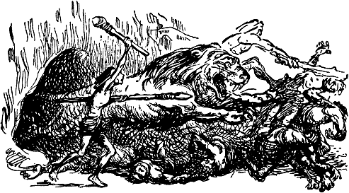 Йому відповів протяглий рев, махайродус зробив два велетенські стрибки. Та перш ніж він стрибнув ще раз, списометалки Ауна й Зура вже метнули свою зброю. Дротики застрягли в тілі хижака, і він оскаженіло кинувся на людей. Син Тура ударив списом між ребер, Зурова зброя обдерла міцний череп... А звір уже був біля них.