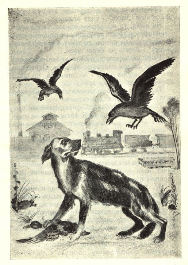Ну, думаю, це він ще й ворон ловитиме. Цікаво подивитися. І справді, ходить ворона перед самим собачим носом, націляє на качку. Собака лежав, лежав, коли як кинеться до ворони. Вона собі: «карр!», підлетіла трохи, знову сіла. Собака до неї, а друга ворона вже сіла на качку, довбає тим часом. Собака добрав, що його обдурено, і назад до качки. Ворона качку покинула і підлетіла. Літають обидві, крутяться над самою собачою головою. Тепер собака, видно, вирішив плюнути на ворон, бо всеодно не впіймаєш, і взявся знов до качки. Зараз же обидві ворони посідали і ходять навколо. Коли одна як довбоне собаку в хвіст. Загарчав собака і до ворони, а друга тим часом качку довбе. Стало собаці жарко. Тут не те, щоб упіймати, а мабуть не дадуть прокляті ворони й поснідати як слід. Треба тікати. Собака підхопив качку і подався підтюпцем геть від моря. Але й воронам сподобалося качине м'ясо. Вони — за собакою. Одна над головою крутиться, зазирає в очі — от-от виклюне око! А друга сяде на спину собаці, довбоне і одлетить. Собака кричить, повертається до неї, тоді перша ворона його ззаду б'є. І спереду лихо і ззаду біда. Присів собака, хвоста підібгав, гарчить, зубами клацає. А ворони насміліли, уже й сидячого довбають. То одна, то друга. Коли собака високо-високо заскавчав, покинув качку і втік. Ще трохи провели його ворони, на прощання ще разів зо два довбонули, щоб не забував, і повернулися до качки. Так дві ворони подужали одного собаку.