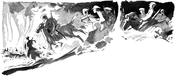 Поздно ночью по всему оазису завыли собаки. По роще между крепостными стенами бешено протопотал конь. Бессильный, тихий удар в ворота, сопровождаемый стоном, поднял на ноги дневального. Разбуженный Ворон подошел к воротам. С улицы в приоткрытую щель ворвался конь. Он был в мыле и дрожал всем телом. Прямо к ногам командира с седла сполз человек. Дневальный поднес фонарь. Старый узбек, стоя на четвереньках, с трудом поднял голову кверху. На секунду он как будто исчез в темноте. Фонарь качнулся в руке пошатнувшегося молодого красноармейца. Потом белый круг от фонаря пробежал по земле и снова в упор осветил окровавленную человеческую маску. Борода раненого вымокла в крови. Вместо ушей и носа зияли раны. Изувеченный человек тихо бормотал что-то, но Ворон не понял, что именно. — Дарган-Ата, Отец Лоцманов… — отчетливо проговорил, наконец, раненый. — Тревогу! Фельдшера! — как эхо отозвался Ворон, подхватывая падающего лицом вперед старика. Через несколько секунд, раздирая уши, медная труба задребезжала тревогу. Началось что-то невообразимое. Дневальный подбежал к груде сухой колючки, приготовленной для этого случая. Он вылил на нее банку керосину и бросил спичку. Весь двор осветило, как днем. Отчаянный рев перепуганных верблюдов, ржанье коней и топот бегающих кавалеристов — все это вспыхнуло, как пламя, и так же быстро погасло. Посреди двора в темноте стояли стройные ряды всадников. — Пусть верблюды идут следом. При орудии оставить пулемет и десять человек. Са-а-ди-ись! Тесные ряды рванули в карьер и понеслись в непроницаемый мрак. Почва была каменистая, и лошади шли легко. В ночном небе протянулась закатная розовая полоса. Потом она стала яркой. Скоро в небе заполыхало пожарное зарево и осветило серые пески. Какой-то непрерывный, ровный звук наполнял пустыню. Его было слышно сквозь гром копыт эскадрона. Потом он расщепился в аккорд — и стало ясно слышно человеческие голоса: