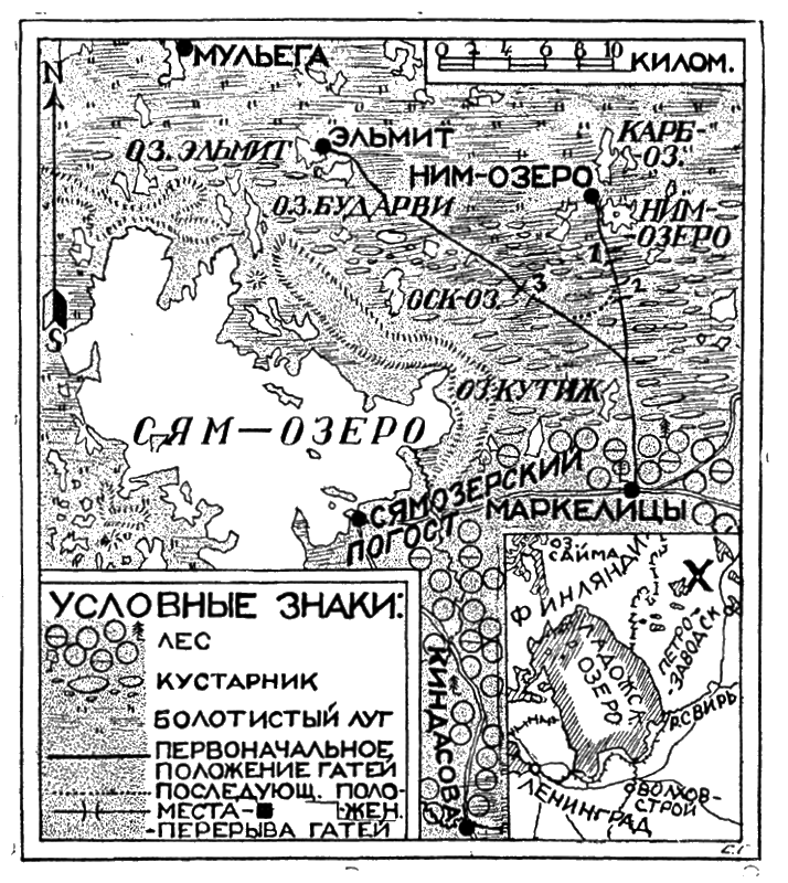 В Маркелицы, в штаб полка привели перебежчика. Он был в рваной шинели, без шапки, и на лице его застыл страх. Он еле шел, и конвоировавшие его два красноармейца то и дело подталкивали его и негромко предлагали: — Иди, что ль. Некогда здесь с тобой… Перебежчик боялся наказания и поэтому с изумительной быстротой, захлебываясь словами, выпалил перед командиром полка все, что знал о белофиннах. Большая часть сведений, которые он сообщил, были и раньше известны красным через разведчиков, но одно сообщение оказалось новостью. Перебежчик передал, что сегодня ночью рота бело-финнов обходным движением пришла в Ним-озеро, в деревню в 20 верстах от Маркелиц, и в следующую ночь намерена перейти по гатям через Липочагское и Кутижское болота и внезапно напасть на Маркелицы с тыла. Немедленно после того, как перебежчика увели, командир полка вызвал в штаб командира второй роты Алексеева. Алексеев только что собрался ехать на Сян-озеро, где пошаливала какая-то белая банда, и сидел уже на своем сером в яблоках коне, когда вестовой передал ему приказ командира, — и поэтому он явился в штаб полка в полной боевой готовности. Командир полка вкратце сообщил ему сведения, полученные от перебежчика. — По приказу начальника дивизии, — сказал командир полка, — мы должны запирать линию Сям-озера — Киндасова. Эта линия беспокойная, и людей брать оттуда мы не можем. Вы знаете болота к северу от Маркелиц? Алексеев ответил утвердительно. — Как можно перейти их? — Только по гатям. — Как идут гати и что они из себя представляют? — Одна гать идет из Ним-озера прямо на юг до самых Маркелиц, другая— от озера Эльмит и соединяется с первой в версте к северу от Кутижского озера. Обе они представляют из себя всего лишь бревна и доски, проложенные вдоль болота, и по нивд можно пройти только гуськом. — Значит, чтобы из Ним-озера подойти к Маркелицам, белые могут воспользоваться лишь одной гатью? — Да, одной. — Есть у вас в роте три ловких, сильных и верных человека, хорошо знающих местность? — Да, есть. — Сегодня вечером они должны в нескольких местах разобрать гать и спутать их так, чтобы белые заблудились в болоте. На вашу личную ответственность. — Хорошо, товарищ, будет сделано.* * *