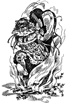Кеми, молодая жена горбуна Поду, сидела на снегу и тоскливо выла. Кеми хотела есть. Она не ела уже пять дней, и желудок ее властно требовал пищи. Пищи же не было, и Кеми протяжно скулила, запрокинув голову назад. Пошла уже вторая неделя, как Кеми ушла из становища Гагары, в котором Лон-Гат собирал ясак (дань) человечьими головами. И за все это время она ничего не ела, кроме двух тощих куропаток, попавшихся в расставленные ею по берегам лесного ручья слопцы (ловушки). Извиваясь всем телом, Кеми проползла несколько шагов по снегу. Это окончательно исчерпало запас ее сил, и она впала в полузабытье. Кеми казалась, что она доползла уже до ловушки и увидала, что в одну из них попала жирная «важенка» (самка) дикого оленя. Однако ей это нисколько не показалось странным. Лязгая зубами, как голодная собака, Кеми подползла к «важенке» и впилась ей в горло зубами… Сильная боль вернула Кеми к действительности. В полузабытье она до крови впилась крепкими зубами в собственную руку… Упираясь в землю руками, как тюлень-ластами, Кеми снова поползла к ручью. Первые четыре слопца оказались пустыми, около них не было даже следов куропатки. В пятом же Кеми нашла раздавленную упавшим бревном полярную куропатку. Кеми ободрала ее зубами, словно песец, и, радостно повизгивая, принялась глодать… После отъезда Ямру голод скоро нашел дорогу к становищу Гагары. Когда вонзь ушел обратно в океан, мужчины отправились в леса расставлять слопцы на полярных куропаток и тетеревов. Но тех и других было мало, и добытой самоедами птицы нехватало даже для детей. И после того, как были убиты и съедены все собаки в становище Гагары, люди начали умирать с голода. Тело их распухало до чудовищных размеров. Из почерневших десен шла кровь, и зубы из них выпадали так же легко, как орехи из прошлогодних кедровых шишек. Так умерли старая Атра, пастух Поду, шаман Ного и многие другие мужчины, женщины и дети… Устрашенные их судьбой, лесные люди стали один за другим покидать становище Гагары. Вскоре становище совсем обезлюдело. Из отверстий юрт не тянулись струйки дыма, и нигде не было видно живого существа. Глубокое безмолвие мертвого становища нарушалось по ночам довольным урчанием горностаев, подкрадывавшихся к юртам лакомиться мерзлыми трупами людей…VI. На помощь лесным людям.