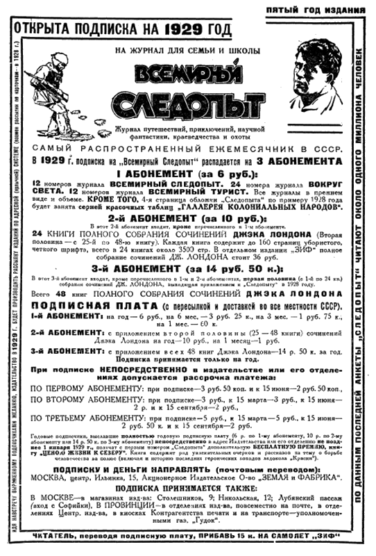 Товарищи читатели! Открыта подписка на «Следопыт» и его приложения. Проведенная читательская анкета показали полную готовность читателей внести свою посильную лепту на постройку самолета «Земля и Фабрика». НЕ МЕНЬШЕ 15 КОПЕЕК НАДБАВКИ В ФОНД «НАШ ОТВЕТ ЧЕМБЕРЛЕНУ» К ПОДПИСНОЙ ПЛАТЕ НА 1929 ГОД! — вот голос читателя. В настоящее время фонд пролетарской обороны имеет уже внушительную цифру—7000 рублей. Это — по копейкам, по пятакам, по гривенникам. Какой огромной должна быть читательская аудитория, чтобы собрать такую сумму! По приблизительному подсчету оказалось, что если напечатать фамилии всех читателей, приславших деньги в фонд «Наш ответ Чемберлену», то это займет около половины объема номера «Следопыта». Кстати нужно заметить, что напечатание этого списка отдельной вклейкой стоило бы очень дорого. Принимая во внимание всю нецелесообразность печатания списка, также многочисленные письма читателей, решительно протестующих против занятия места в «Следопыте» для сухого ненужного списка, редакция и издательство решили отказаться от этого. ПЕРЕДАВ СУММУ ДЕНЕГ, ПРЕДНАЗНАЧАВШУЮСЯ ДЛЯ ПЕЧАТАНИЯ СПИСКОВ, В ФОНД «НАШ ОТВЕТ ЧЕМБЕРЛЕНУ».