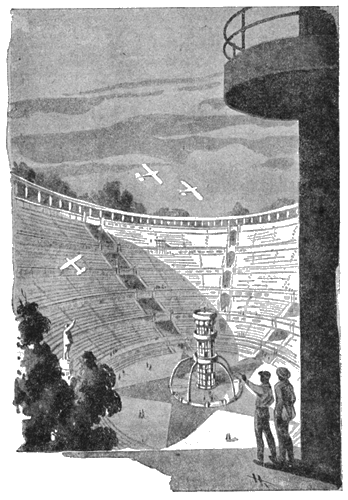 А дальше перелетают — вернее перепрыгивают — через площадь люди с привязными небольшими воздушными шарами, которыеуравновешивают вес их тела. Человек «ничего не весит» и при малейшем прыжке отделяется от земли. Помнится, такой спорт был изобретен в Америке. Но какая ловкость и точность у этих летучих людей! А вот нечто совершенно невиданное. У спортсменов на подошвах прикреплены вероятно пружины, потому что эти спортсмены прыгают так, как впору прыгать только блохе. Этот спорт требует большей ловкости и грозит большим риском, чем прыжки на барабане. Но прыгуны очевидно хорошо тренированы и ловко перепрыгивают через киоски и даже через небольшие деревья. Но, увы, мне опять приходится сдерживать себя, иначе я никогда не окончу внешнее описание города. Пришлось оторваться от интересного зрелища и следовать дальше. Снова тенистая аллея, и вот мы мимо двух белых зданий выходим на большую площадь. Что вам сказать о ней? Сравнить ли ее с огромным кратером вулкана, или же с римским амфитеатром? Глядя на эту площадь, я еще раз убедился, какое огромное преимущество заключается в том, чтобы строить город не десятками и сотнями лет, а строить сразу, по определенному плану. Только при таком условии можно было сделать эту оригинальнейшую в мире площадь. Она имеет совершенно круглую форму. Со всех сторон ее окружают здания, которые построены так, что уступами спускаются к площади этаж за этажом. На каждом уступе имеются возвышающиеся друг над другом ряды скамей. На самой площади, взбегая до высоты первого этажа, расположен уже настоящий амфитеатр, составляющий единое целое с амфитеатром, расположившимся по уступам-этажам окружающих домов. Благодаря такому устройству получается один грандиозный амфитеатр, который может вместить почти все население города. Это настоящая греческая «агора» (площадь), на которой происходили собрания. Любопытно отметить, что несмотря на огромный размер площади, она может покрываться особыми тентами во время дождя или сильного зноя. Посредине площади находится высокая трибуна, снабженная мегафонами, которые делают возможным слышать речь оратора одинаково отчетливо во всех уголках грандиозного амфитеатра. В домах, которые расположены вокруг площади, помещаются правительственные учреждения. Это, так сказать, муниципальный центр. В северном углу площади возвышается грандиозная статуя Ленина с поднятой рукой. Представляю, какое величественное зрелище производит эта площадь, когда она полна народа, и в особенности вечером, когда от края до края ее пронизывают огни прожекторов! Ник говорит, что в праздники ее иллюминируют, и тогда получается еще более красивое и торжественное зрелище. Здесь собираются граждане в самые торжественные и важные минуты общественной жизни.
