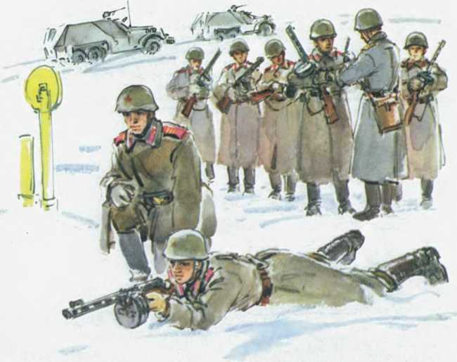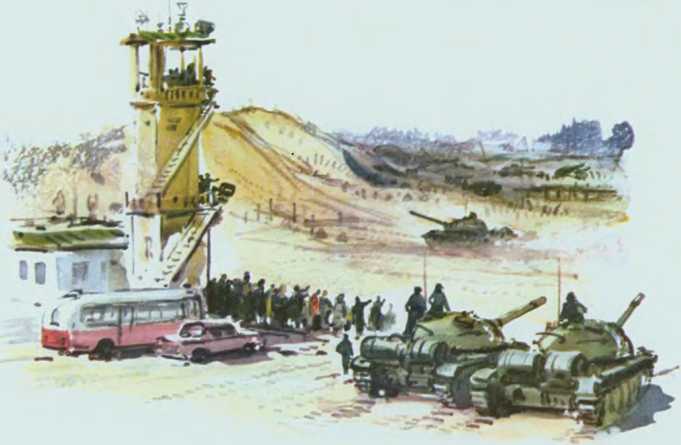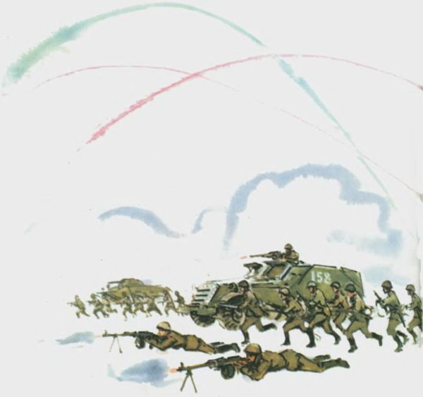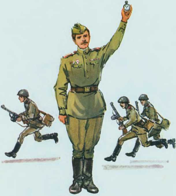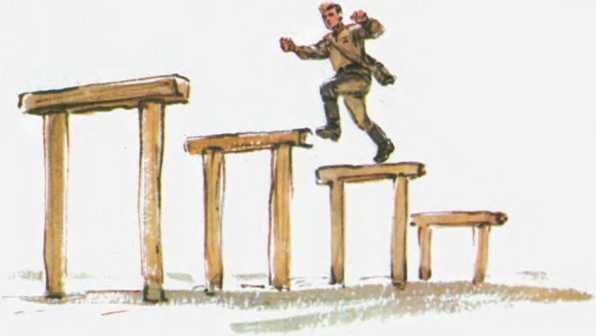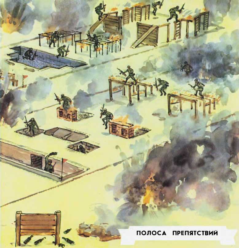 Когда я служил в армии, полоса препятствий, на которой мы тренировались, была куда проще, чем теперь. А как она выглядит теперь, вы видите на этом рисунке. Рассмотрите его повнимательнее. Рассмотрите каждое препятствие, которое надо преодолеть солдату. Пробежать по буму, пробраться сквозь хитроумные переплетения проволоки, проползти под брёвнами, перепрыгнуть через яму с водой, не замешкаться в огненном лабиринте, перебраться через забор, преодолеть горящий разрушенный мост, взобраться по разбитой лестнице, перетащить ящик с патронами, пробраться по подземному ходу сообщения, затем, укрывшись в окопе, метнуть в цель противотанковую гранату— и дальше, дальше, вперёд! А впереди ещё один каменный забор и наконец фасад пылающего дома: самое последнее, самое тяжёлое усилие — подтянуться, добраться до окна на высоте в три с половиной метра, пролезть сквозь окно, спрыгнуть вниз… И после всего этого быть готовым к бою.
