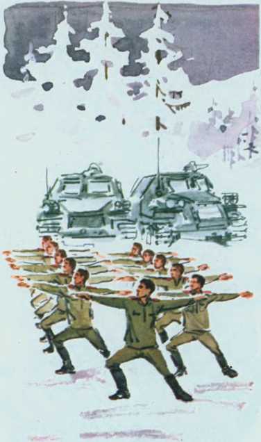 — Что я! — сказал Кукушкин, когда мы вернулись в казарму. — Вот у меня есть друг! Степанов его фамилия. Смелый человек. Можно даже сказать — отчаянный. И я подумал: наверняка мне теперь предстоит искать этого Степанова. И если дальше дело пойдёт так же, то мне, пожалуй, ещё нескоро удастся вернуться в редакцию. — В прошлом году тут, недалеко от нас, километров за пятьдесят, обнаружили минное поле. Старое минное поле, ещё от войны осталось. Сотни мин, говорят, там были. И вот сапёры наши поехали разминировать это поле. А вместе с сапёрами должны были отправиться и танкисты — самые опытные механики-водители… — Зачем же танкисты? — удивился я. — Как зачем? Помогать сапёрам. Это раньше танк боялся каждой мины. А теперь нет. Теперь впереди танка катится специальное приспособление — трал. Идёт такой танк, медленно идёт и утюжит тралом поле. Вот мины и взрываются.