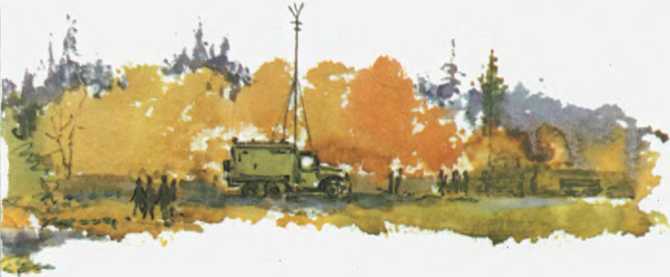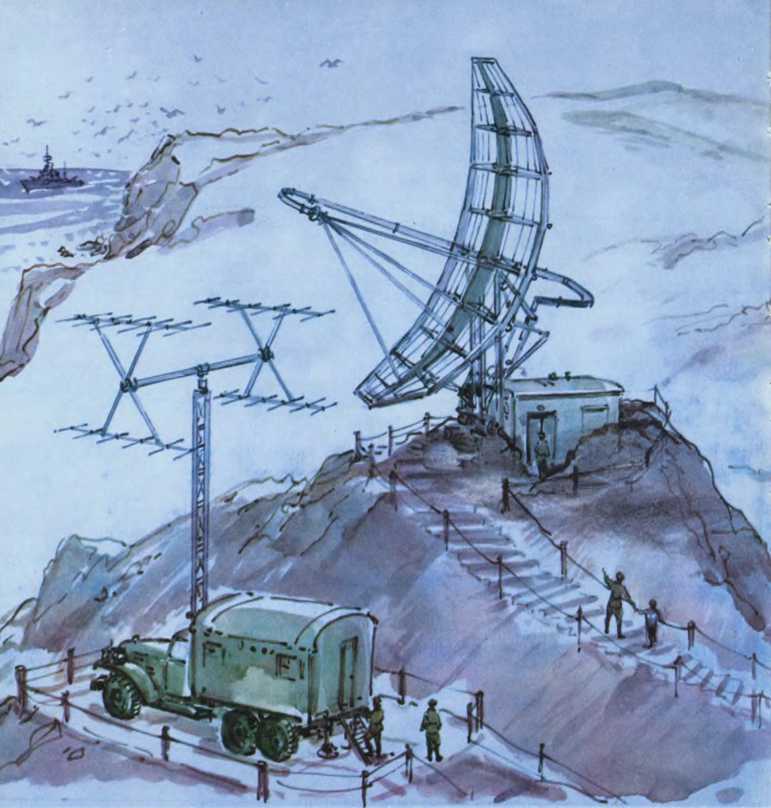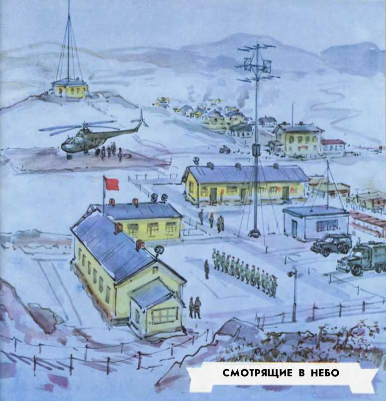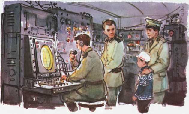 Круглые сутки — и зимой, и летом, и в ясную погоду, когда светит солнце, и в ненастье, когда льёт дождь, — смотрят в небо антенны радиолокационных станций, круглые сутки дежурят у светящихся экранов радиолокаторов солдаты ПВО — противовоздушной обороны.