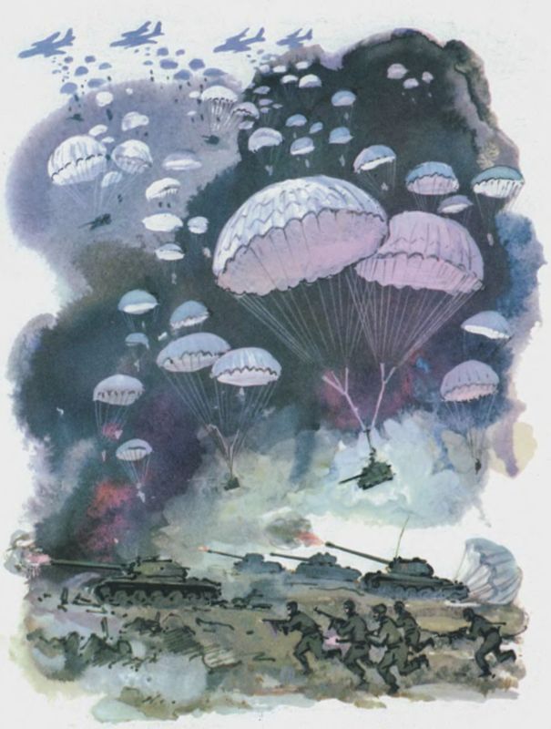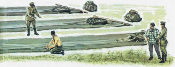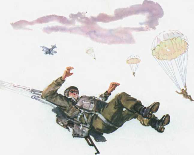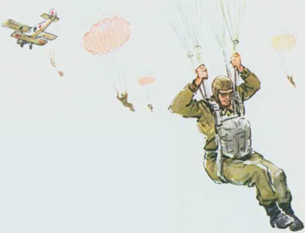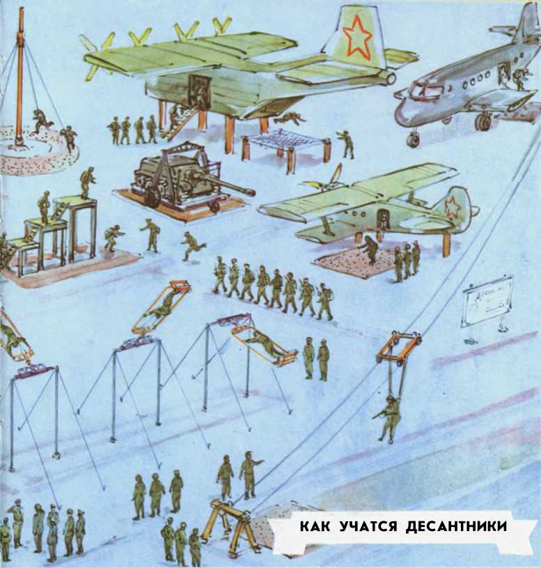 Справа вытянулась вверх тренировочная парашютная вышка: видите — один солдат уже приготовился прыгать? Неподалёку стоят макеты самолётов — здесь солдаты учатся правильно выходить, или, как говорят десантники, «отделяться» от самолёта, в точности так, как потом они будут делать это в воздухе. А вон видна и деревянная горка, на которой десантники выполняют своё самое первое, самое простое упражнение, чтобы научиться приземляться по всем правилам, и специальные качели — лопинги. Ещё чуть подальше — видите? — парашюты подвешены под перекладинами. А под неподвижным парашютом висит человек. Так десантники учатся управлять парашютом. Допустим, подует ветер слева, начнёт относить парашют в сторону, значит, надо тянуть за одни стропы, подует ветер справа — за другие. Если этому не научишься на земле, если не потренируешься как следует, учиться в воздухе будет уже поздно. А вот справа по наклонному тросу на специальном приспособлении стремительно летит вниз десантник с автоматом. Он тоже сейчас учится — учится владеть в воздухе оружием.