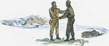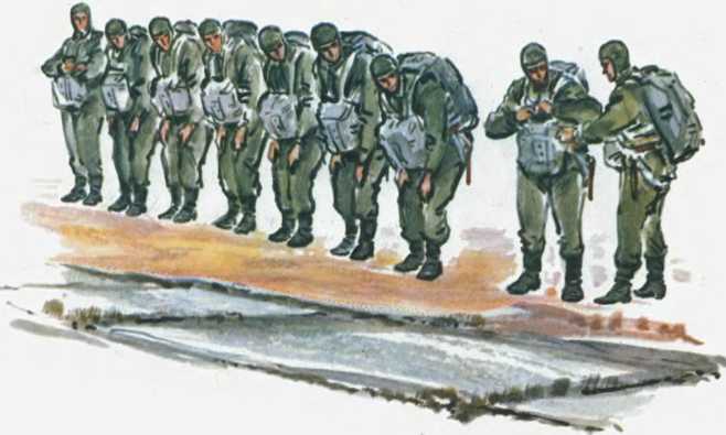 Наконец и тренировка, и укладка парашютов, и медкомиссия, и все волнения и переживания — а вдруг врачи забракуют, вдруг окажусь негоден? — остались позади. Наступил день прыжков. Первый раз в жизни я прибыл на аэродром не как пассажир. Уже на аэродроме надел комбинезон, надел парашют. А когда мне ещё вручили тяжёлый десантный нож в пластмассовых ножнах, тут уж я почувствовал себя настоящим десантником. Нож обязательно входит в снаряжение парашютиста — на случай, если запутаются стропы и их придётся перерезать. Мы стояли слегка нагнувшись, упершись ладонями в колени — такова обычная стойка десантника: ведь парашют весит немало, а если к этому ещё прибавить автомат, противогаз, фляжку с водой, патроны, сапёрную лопатку, ранец, плащ-палатку, сухой паёк — вес наберётся порядочный. Начальник парашютно-десантной службы в последний раз осмотрел наши парашюты, проверил, всё ли в порядке.